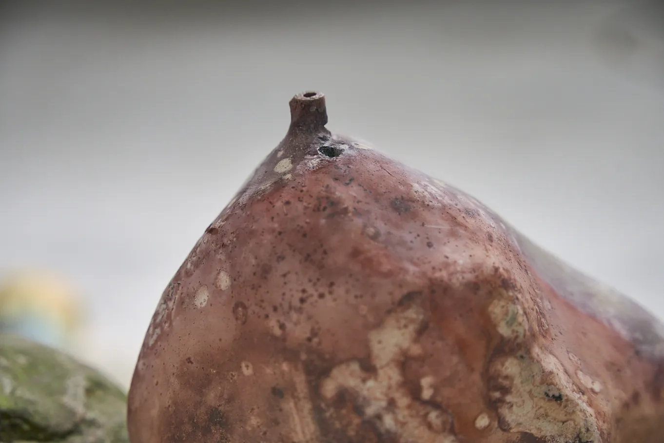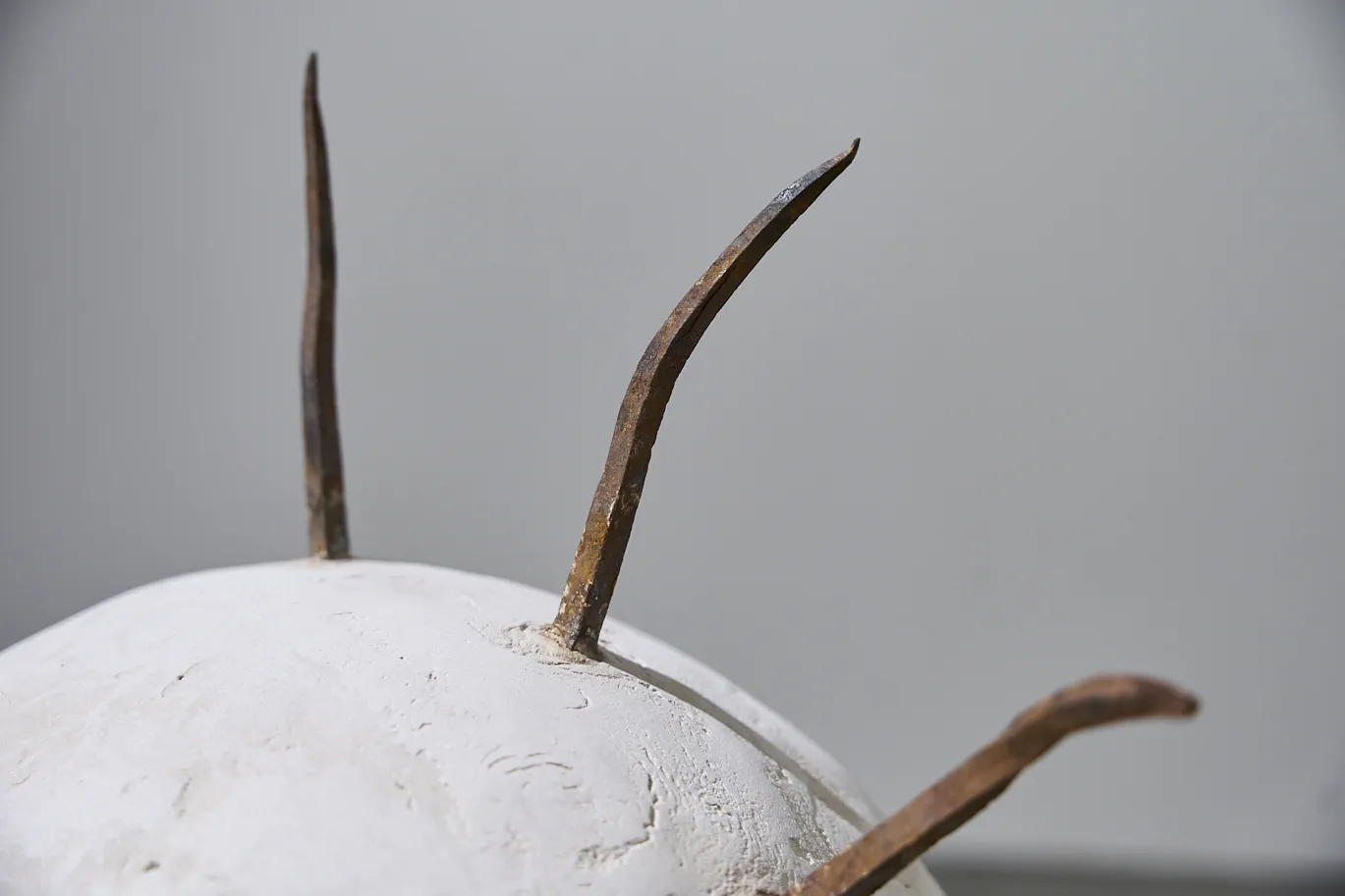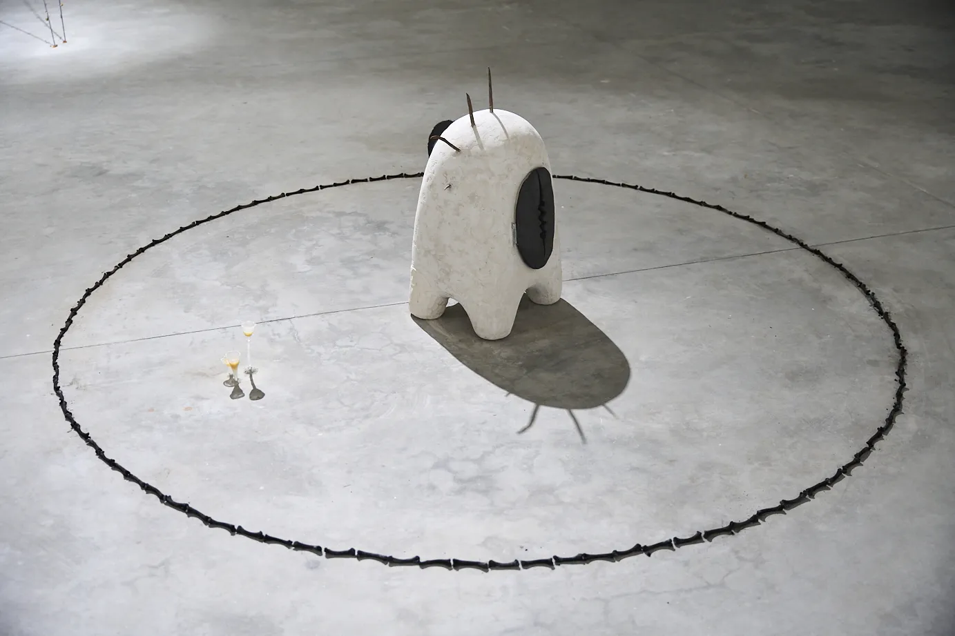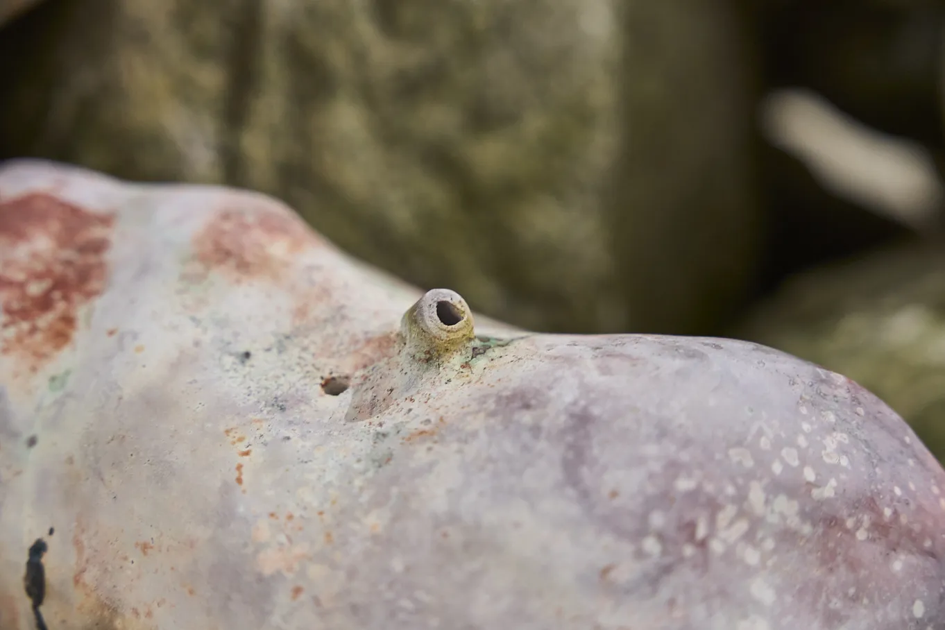 The work is inspired by the shape of the melon, the echolocation organ found in the bodies of cetaceans. Composed of a mass of adipose tissue located in the forehead, the melon is the primary organ that enables vocalization and communication among whales, profoundly shaping the ways in which they socialize and build their cultural identity. Deeply moved by the ways whales live, socialize, and evolve, the artist transforms this organ into a whistle — a man-made clay object — thus drawing closer to the way cetaceans communicate beyond the boundaries of language.