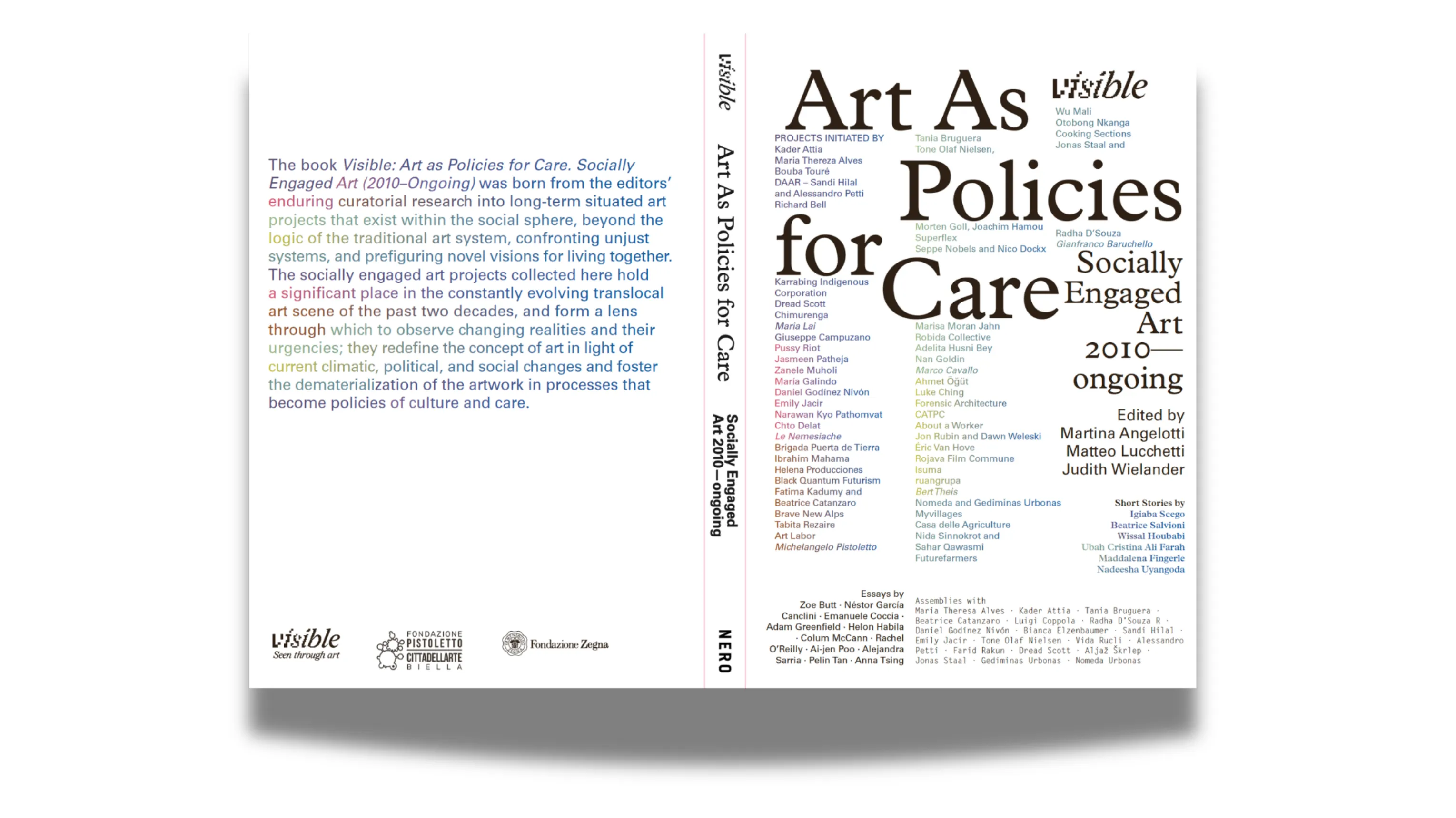 Visible: Art As Policies for Care - Socially Engaged Art (2010—ongoing) è una pubblicazione che esplora il potenziale trasformativo delle pratiche artistiche socialmente impegnate, in dialogo con oltre cinquanta artiste/i e collettivi, e rappresenta il culmine di quindici anni del progetto Visible e della ricerca curatoriale di Martina Angelotti, Matteo Lucchetti e Judith Wielander sul rapporto fra arte e sfera pubblica. Il volume presenta una scena di pratiche artistiche che interpretano il ruolo sociale dell’arte e la sua dematerializzazione in politiche culturali e di cura, in grado di affrontare le emergenze climatiche, sociali e politiche del nostro tempo. Il libro è immaginato come una pubblicazione polifonica, con voci di artiste/i, curatrici/ori, autrici di letteratura contemporanea, giornaliste/i, attiviste/i, e membri di varie comunità. Questi contributi eclettici forniscono molteplici strumenti di comprensione e punti di accesso sull’impatto dei progetti raccontati nel libro e del loro potenziale nell’ ispirare nuove politiche per la cura all’interno della società. Emerge tra le pagine il racconto di un movimento translocale, del quale il libro evidenzia l’interconnessione tra luoghi geograficamente distanti tra di loro e la comunione tra posizionamenti artistici che stanno trasformando il discorso sull’arte socialmente impegnata a livello globale.