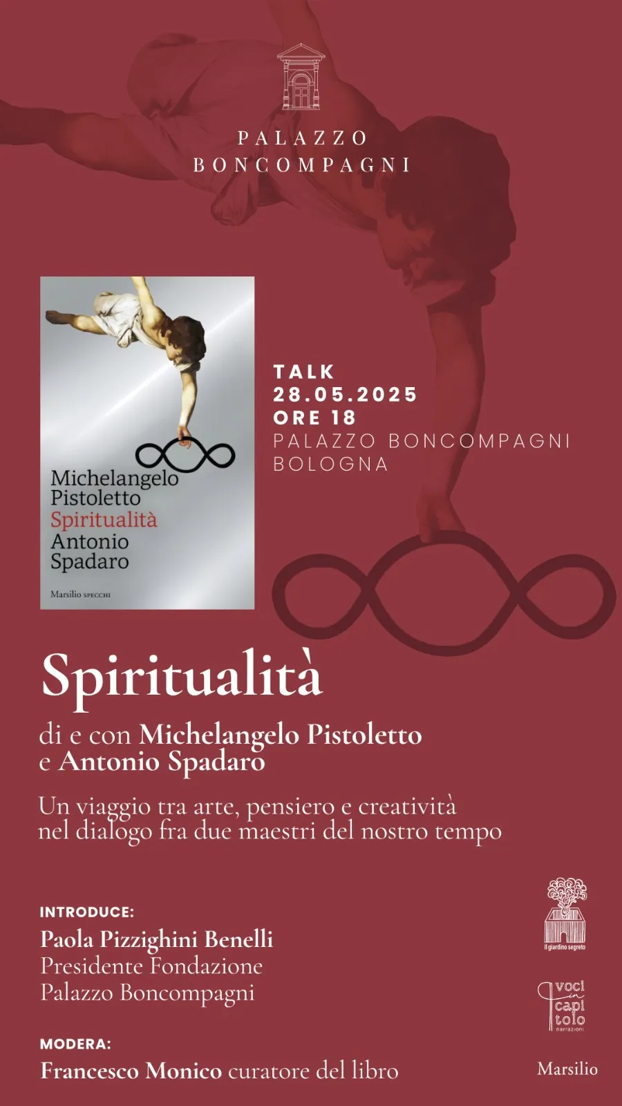"Michelangelo Pistoletto e io faremo un viaggio tra arte pensiero e creatività": ha presentato così Antonio Spadaro, sulla sua pagina Instagram, l'incontro odierno a Palazzo Boncompagni a Bologna, che vedrà il gesuita confrontarsi con l'artista sul loro nuovo libro, Spiritualità. Edito da Marsilio e curato da Francesco Monico, il volume si pone come un viaggio tra arte, fede e creatività avvalendosi infatti di confronto vertiginoso fra due maestri del nostro tempo.