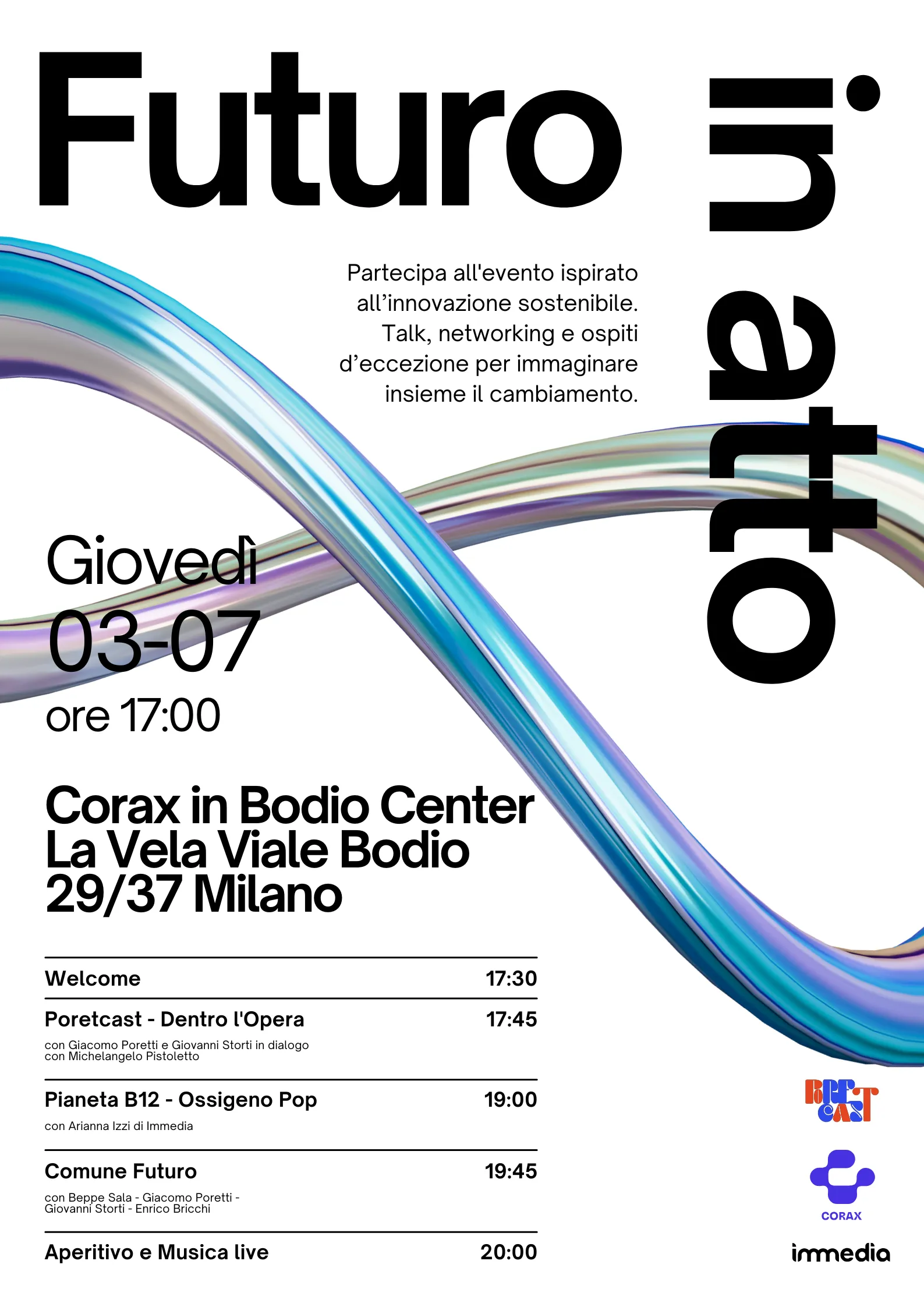 Futuro in atto: è questo l'evocativo titolo dato all'incontro dedicato al cambiamento responsabile in programma oggi pomeriggio dalle ore 17 presso gli uffici di Corax, nell'edificio La Vela a Viale Bodio 29/37 a Milano. "Sarà un’occasione unica - spiegano gli organizzatori - per incontrarsi, ispirarsi e costruire insieme una visione sostenibile e condivisa del domani". Annunciato da Corax e proposto insieme a Immedia e Poretcast, l’evento prevede talk ispirazionali, momenti di networking, arte e musica, oltre alla partecipazione di ospiti d’eccezione. Tra questi, figura Michelangelo Pistoletto, che sarà protagonista a partire dalle ore 17.45 dello speech Dentro l’Opera insieme agli attori Giovanni Storti e Giacomo Poretti: l'inedito trio darà vita a un dialogo originale e coinvolgente sull’arte come strumento di cambiamento e riflessione sociale.