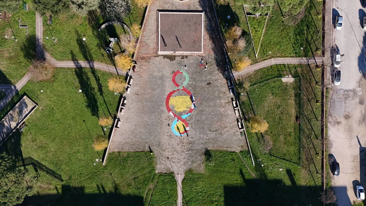 Il Rebirth Day a Latina Un'installazione di dimensioni monumentali (110 metri quadrati di superficie, per una lunghezza di 21 metri) che ha portato sul suolo pubblico i valori della trinamica, oltre al pensiero filosofico e artistico di Michelangelo Pistoletto: il riferimento è all'opera presentata il 21 dicembre a Latina, in Piazza Berlinguer, nel contesto del Rebirth Day. Si è tratta di una pittura pavimentale realizzata nelle giornate del 16 e del 17 dicembre dalla classe 2^ H del Liceo Artistico Buonarroti di Latina, accompagnata dal professor Pierluigi Adamo, con il coordinamento di Francesco Saverio Teruzzi, coordinatore degli Ambasciatori del Terzo Paradiso, e di Jamila Campagna, ambasciatrice del Terzo Paradiso per la città di Latina dal 2023 e referente de IL MURO. Per lo sviluppo spaziale dell’opera gli studenti sono stati guidati dagli architetti Marcello Campagna e Giovanna Di Monaco, mentre per la resa grafica e pittorica sono stati affiancati da alcuni artisti di Latina, ossia Piera Vertecchi, Paola Acciarino, Eleonora Bompieri e dall’architetto Massimo Palumbo. La scelta dei colori per il Terzo Paradiso di Latina richiama la natura e in particolare le caratteristiche del territorio pontino, con un’onda azzurra da un lato, a ricordare il mare, e un’onda verde dall’altro lato, a indicare la campagna dell’entroterra ma anche il verde urbano. Le vernici utilizzate sono ecologiche e di ultima generazione, perfette per garantire la buona tenuta dell’opera nel tempo.