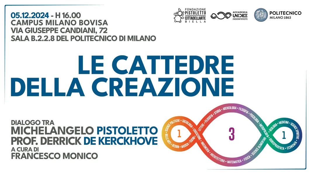 Oggi, alle ore 16:00, il Politecnico - Scuola del Design ospiterà un incontro curato e moderato da Francesco Monico, docente di Filosofia dell’Arte di Accademia Unidee, che vedrà il maestro dialogare con Derrick de Kerckhove. I relatori, per l'occasione, discuteranno sui cambiamenti epocali generati dall’era digitale e sul ruolo delle arti e delle scienze nella trasformazione della società contemporanea.
