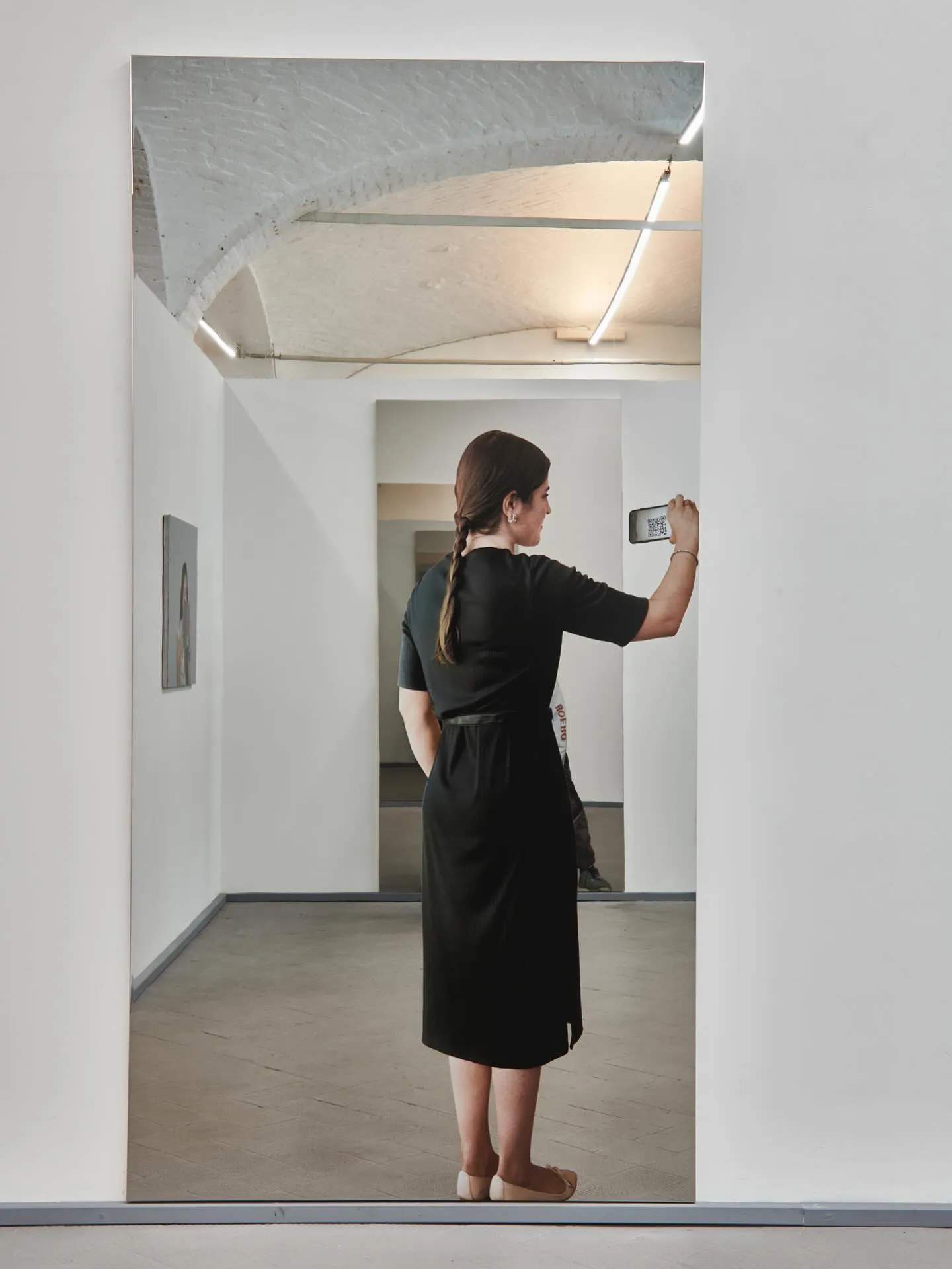 Nell’opera Ragazza che fotografa un Qr Code (2021) la figura fissata sulla superficie specchiante tiene in mano un smartphone nel quale appare un QRcode , attraverso il quale lo spettatore può vedere la mia persona che accompagna i visitatori e illustra il percorso di visita nella mostra dei miei lavori.