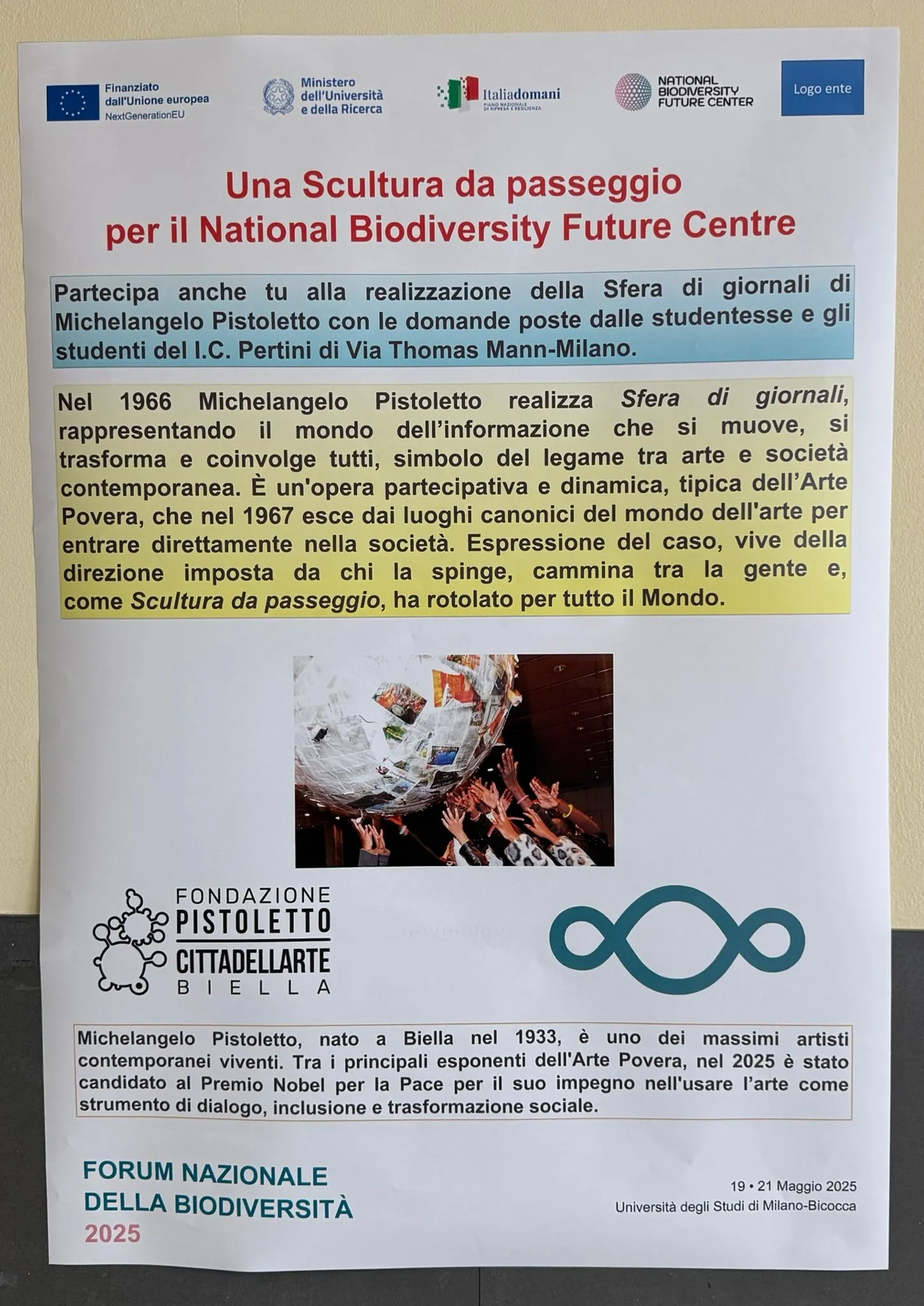 Domani - 21 maggio - alle ore 14.45 presso l'Università degli Studi di Milano-Bicocca si terrà il talk "Il Terzo Paradiso: quando l’arte incontra la natura, l’artificio e reinventa il futuro", che vedrà Pistoletto in dialogo con Marina Calloni. Sempre nell'ambito della rassegna promossa dal National Biodiversity Future Center - NBFC, è prevista performance partecipativa sulla Scultura da passeggio a cura di Francesco Saverio Teruzzi, coordinatore degli ambasciatori Rebirth/Terzo Paradiso, in collaborazione con Letizia Luini, Greta Persico e le classi IV A e IV B dell’I.C. Pertini di Via Thomas Mann-Milan.