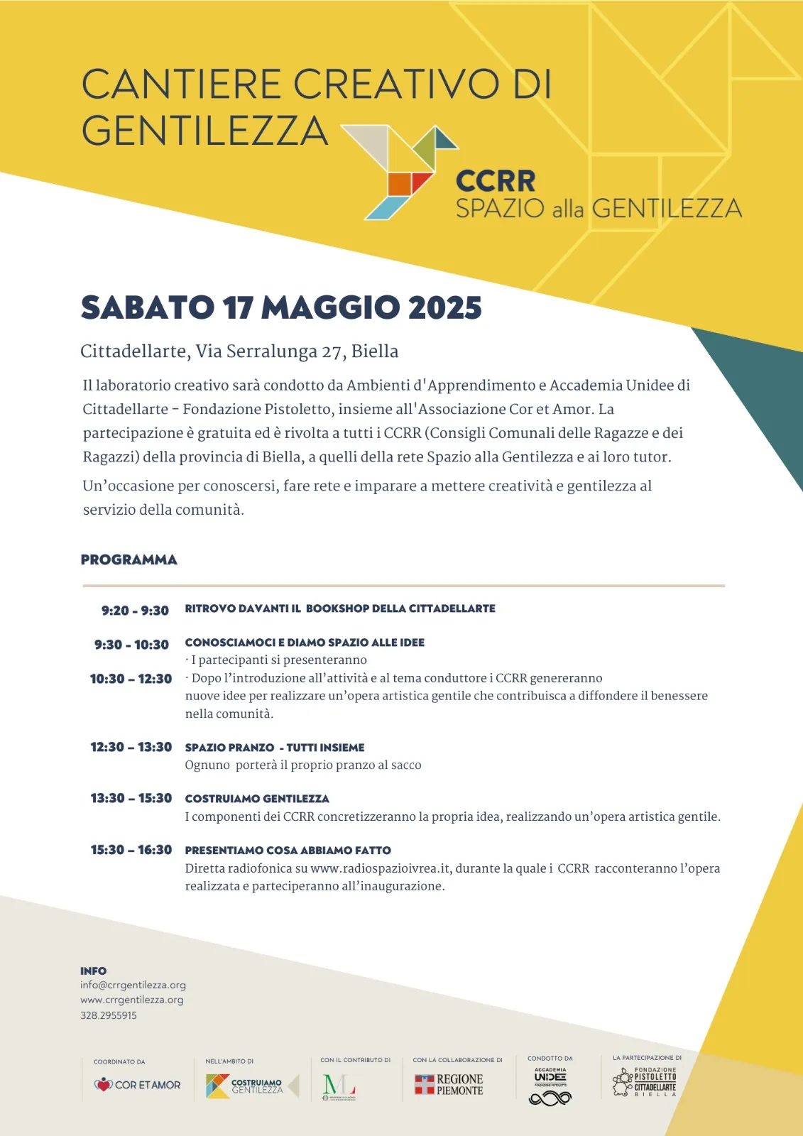 Sabato 17 maggio la Fondazione Pistoletto ospiterà il laboratorio condotto da Ambienti d'Apprendimento e Accademia Unidee insieme all'associazione Cor et Amor. L'iniziativa, in programma dalle 9.20, si rivolge a tutti i Consigli Comunali delle Ragazze e dei Ragazzi del territorio, oltre a quelli della rete "Spazio alla gentilezza" e i loro tutor.