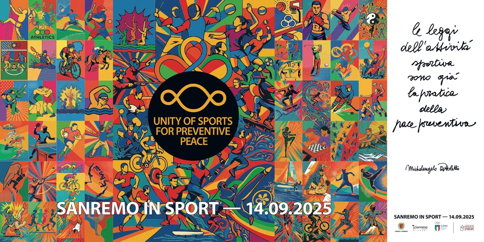 La manifestazione ligure, che si articolerà il 14 settembre dalle 11 alle 18:30 tra il parco di villa Ormond e il lungomare Salvo D’Acquisto, porrà la creatività del maestro sotto i riflettori: sono previsti una grafica ad hoc firmata da Pistoletto, il passaggio della Scultura da passeggio, l'inaugurazione di un'aiuola del Terzo Paradiso e la presentazione del libro “Unity of sports for preventive peace”.