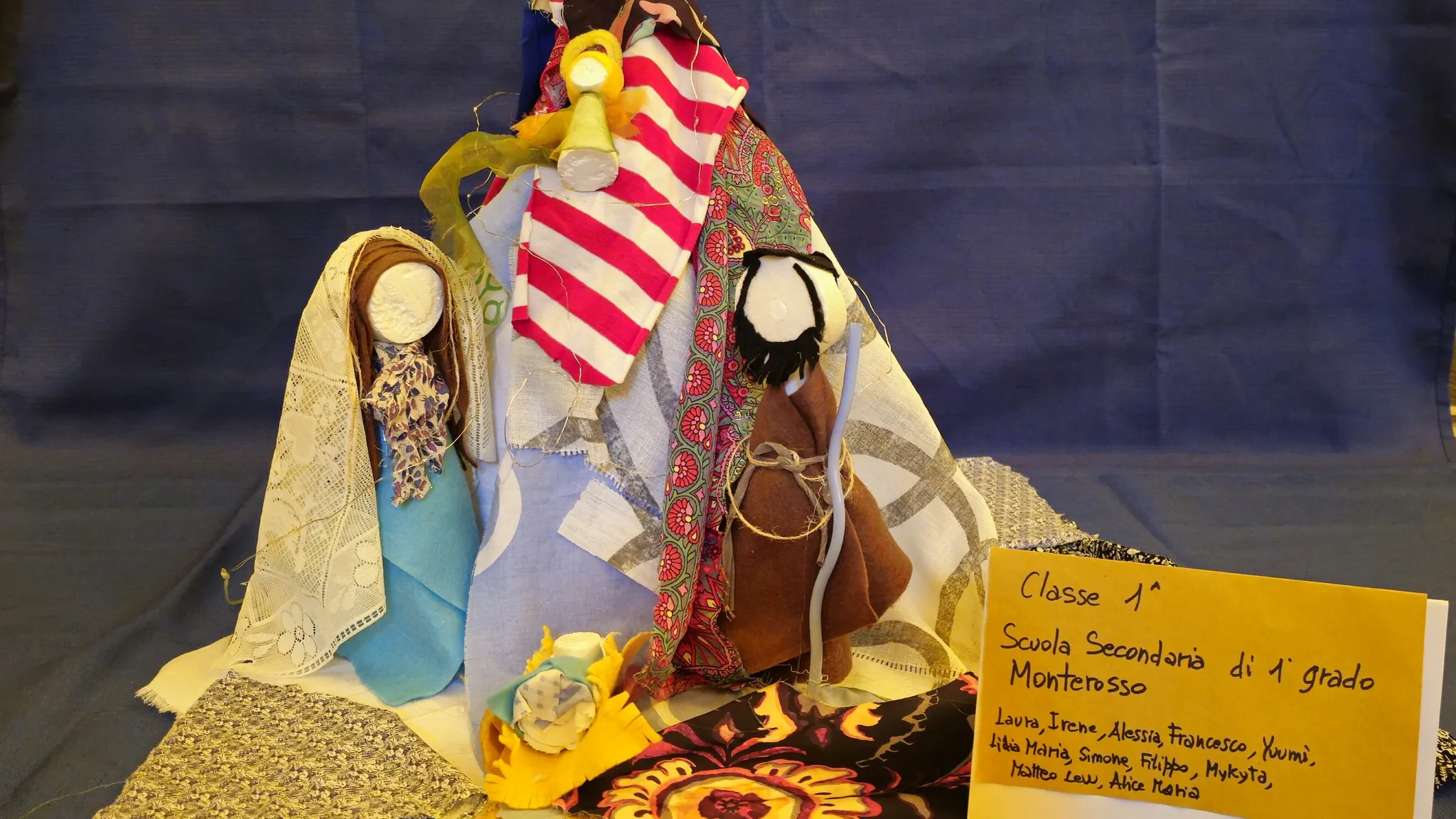 Il presepe ispirato alla Venere degli stracci La classe 1° della Scuola Secondaria di Monterosso, in occasione della mostra, ha modellato il suo presepio facendo riferimento alla Venere degli stracci di Michelangelo Pistoletto. “Questo nostro progetto per il presepe - così la classe - nasce da due elementi di ispirazione: il rispetto dell’ambiente e nello specifico l’attenzione al fast fashion, cioè l’abitudine a comprare e buttare tessuti che poi diventano fonte di grossi problemi ambientali a causa delle discariche nei Paesi di destinazione dei tessuti inutilizzati. L’altro elemento di ispirazione sono le opere dell’artista Michelangelo Pistoletto: l’osservazione della sua Venere ha fatto da preziosa guida per la creazione del nostro presepe”.
