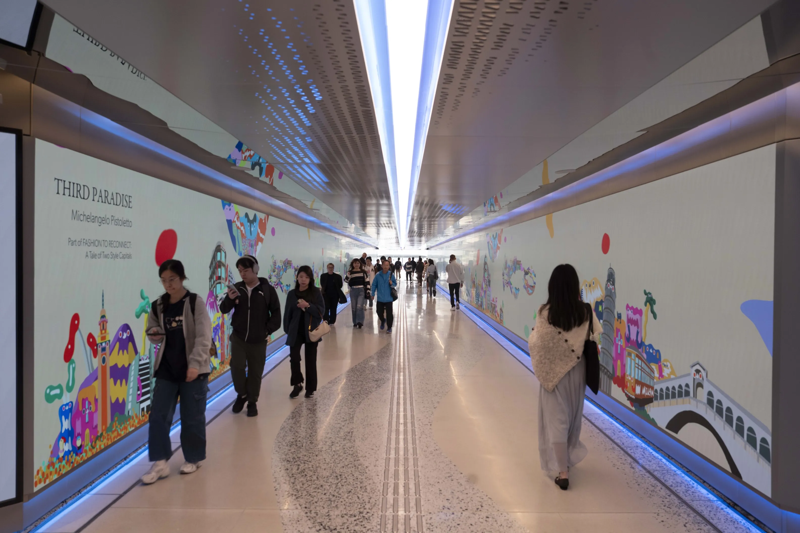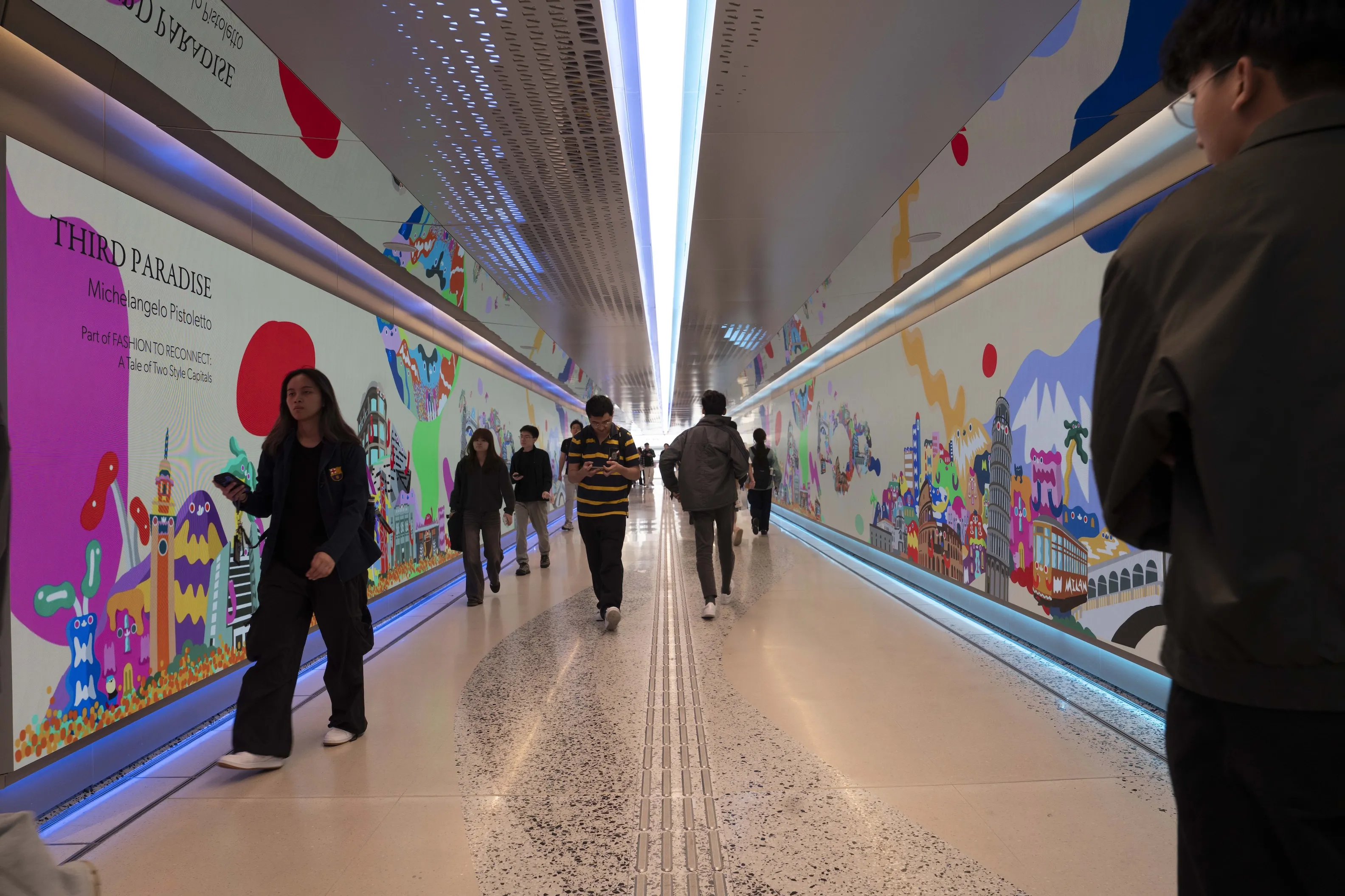 L’artista e illustratrice Zoie Lam ha trasformato il tunnel di 50 metri che collega il campus della CityU al centro commerciale Festival Walk in una sequenza di video panoramici immersivi.