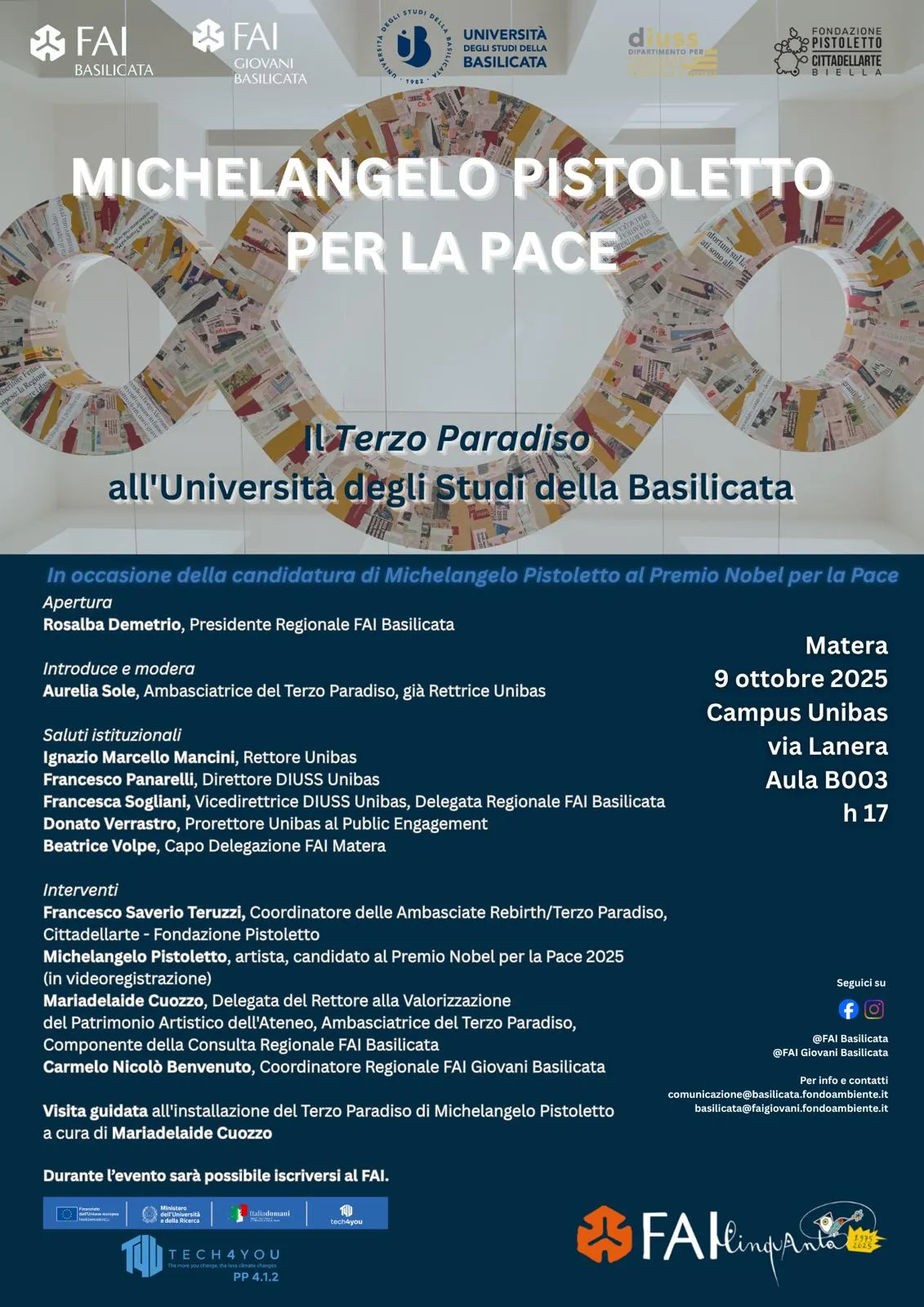 Alle ore 17, presso il Campus di Matera dell'Università degli Studi della Basilicata, si svolgerà l'evento Michelangelo Pistoletto per la Pace. Il Terzo Paradiso all'Università degli Studi della Basilicata, in occasione della candidatura al Premio Nobel per la Pace 2025 del maestro, il quale nel 2019 ha fatto dono all'Ateneo lucano di un suo Terzo Paradiso che è stata collocato permanentemente nel Campus di Matera. L'evento, promosso congiuntamente dall'Università della Basilicata e dal FAI Basilicata, si colloca in apertura delle Giornate d'Autunno del FAI, che celebra quest'anno il suo cinquantenario. "La candidatura di Pistoletto al Nobel per la Pace - spiegano gli organizzatori - rappresenta un esito coerente con il suo lungo percorso in ambito artistico e culturale, iniziato alla metà degli anni Cinquanta del Novecento. Un percorso fortemente orientato verso un'arte di impegno sociale che coinvolge direttamente il pubblico, con l'obiettivo di contribuire a una 'trasformazione responsabile' della società, nel segno dell'accoglienza delle differenze, del dialogo interculturale, della convivenza pacifica, da Pistoletto tradotta nella sua formula della Pace preventiva, e della ricerca di un equilibrio tra rispetto dell'ambiente e sviluppo. Vanno in queste direzioni le molteplici iniziative di Cittadellarte e su questi significati si fonda il segno-simbolo del Terzo Paradiso che Pistoletto ha ideato e proposto, a partire dall'inizio di questo millennio, in diversi contesti nazionali e internazionali". L'evento, inoltre, si avvale del patrocinio della Fondazione Pistoletto.