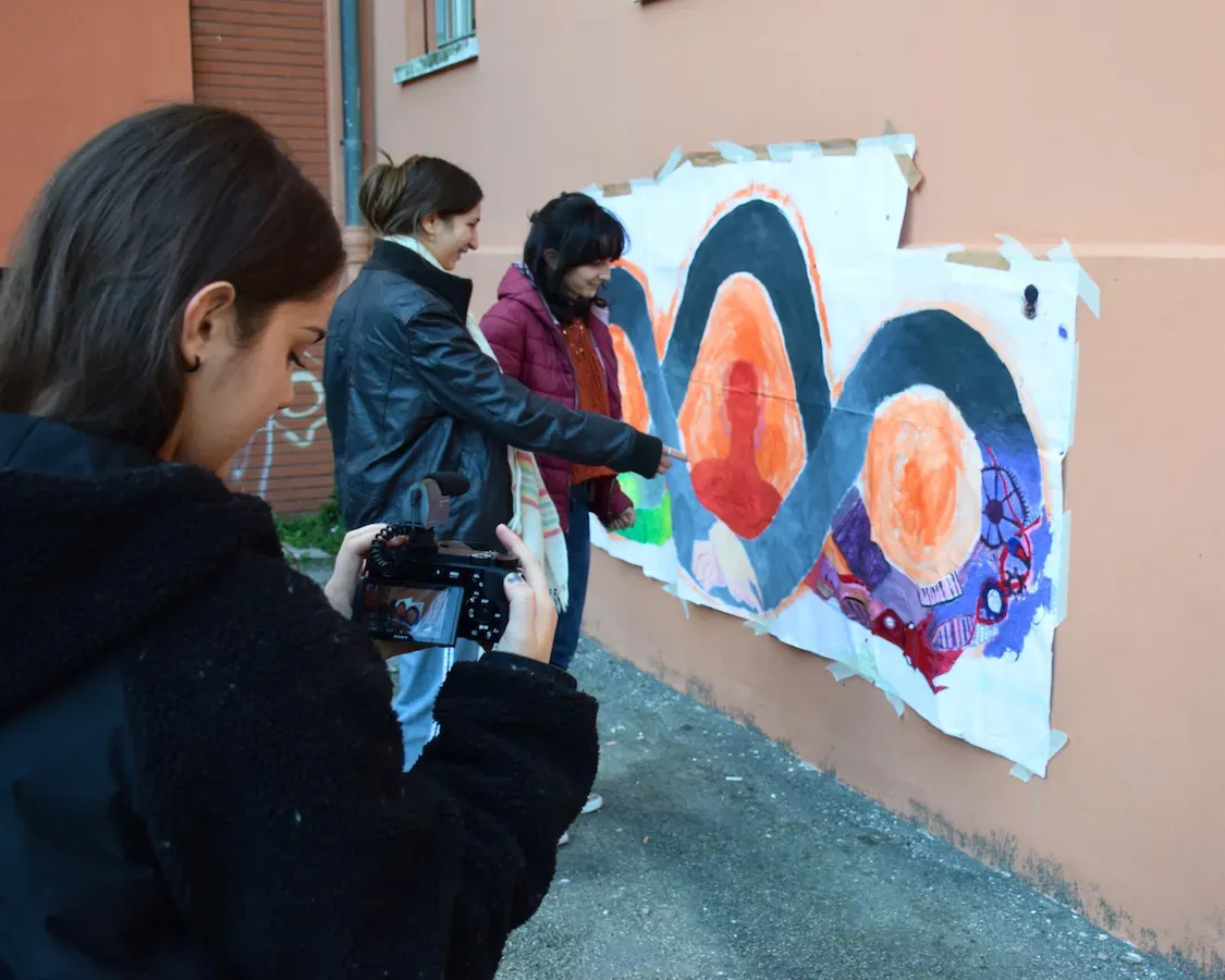 Parallelamente alla realizzazione del murale, è stato attivato un secondo laboratorio dedicato alla documentazione del progetto attraverso la produzione di un video. Questo percorso ha permesso agli studenti di acquisire competenze nel campo della narrazione visiva grazie alla collaborazione con due realtà associative del territorio: Carta Bianca (Valsamoggia) e Open Group (Bologna). Mentre Carta Bianca ha affiancato i liceali nella realizzazione concreta del video, guidandoli nelle riprese e nel montaggio, Open Group ha messo a disposizione l’esperto Raffaele Posulu. Quest’ultimo ha guidato le classi in un processo creativo che è iniziato con un brainstorming collettivo: “Abbiamo messo insieme tutte le teste dei ragazzi”, spiega Russo. “Ognuno voleva condividere la propria visione e, passo dopo passo, siamo arrivati a un’idea riassuntiva che raccoglie tutte le proposte”.