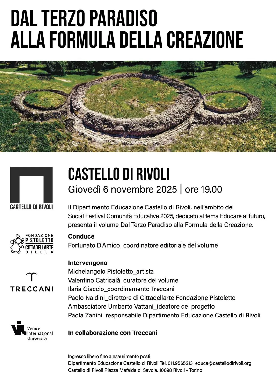 Il 6 novembre il Dipartimento Educazione Castello di Rivoli, nell’ambito del "Social Festival Comunità Educative 2025" dedicato al tema "Educare al futuro", proporrà un incontro per raccontare la nascita e l’evoluzione dell’opera Terzo Paradiso di Michelangelo Pistoletto. Prevista, su questa scia, la presentazione del volume - edito da Treccani - dedicato al simbolo trinamico.