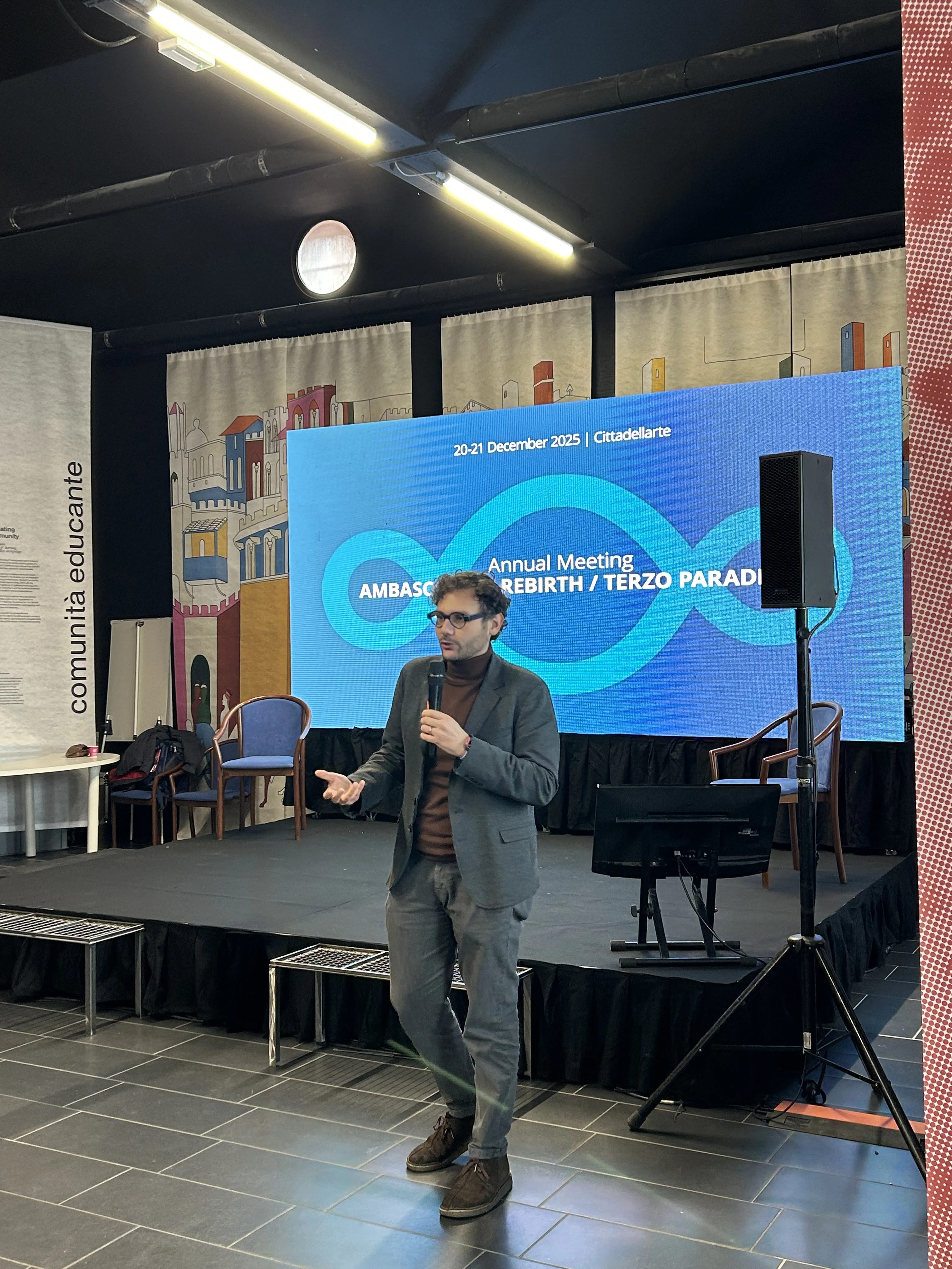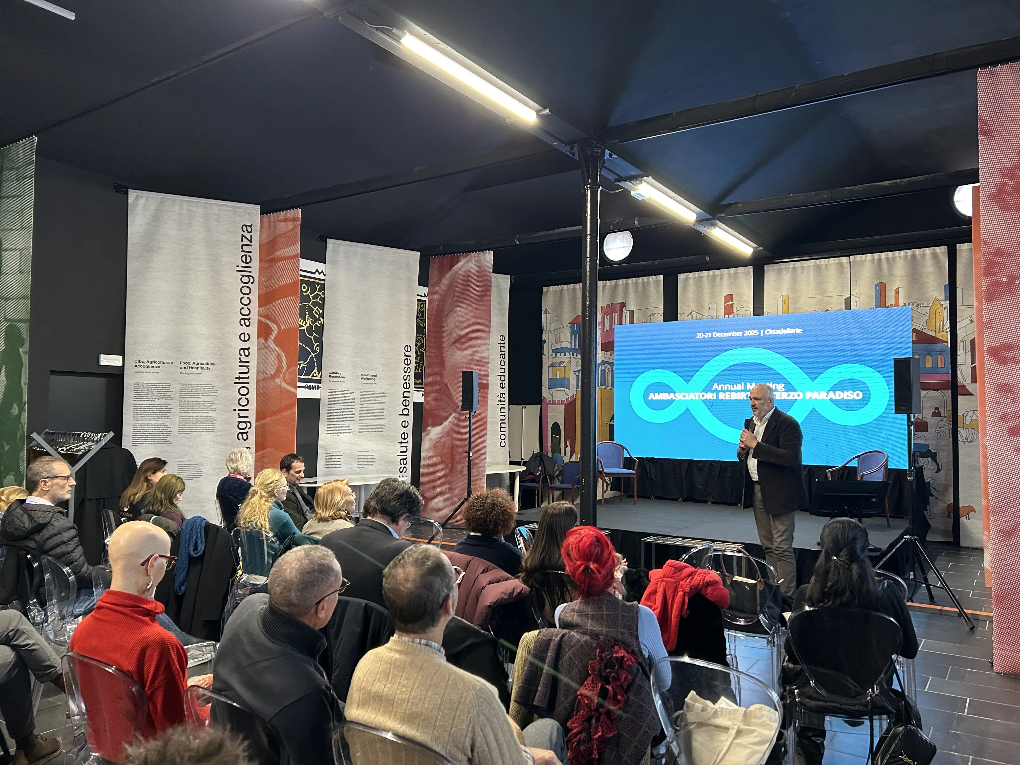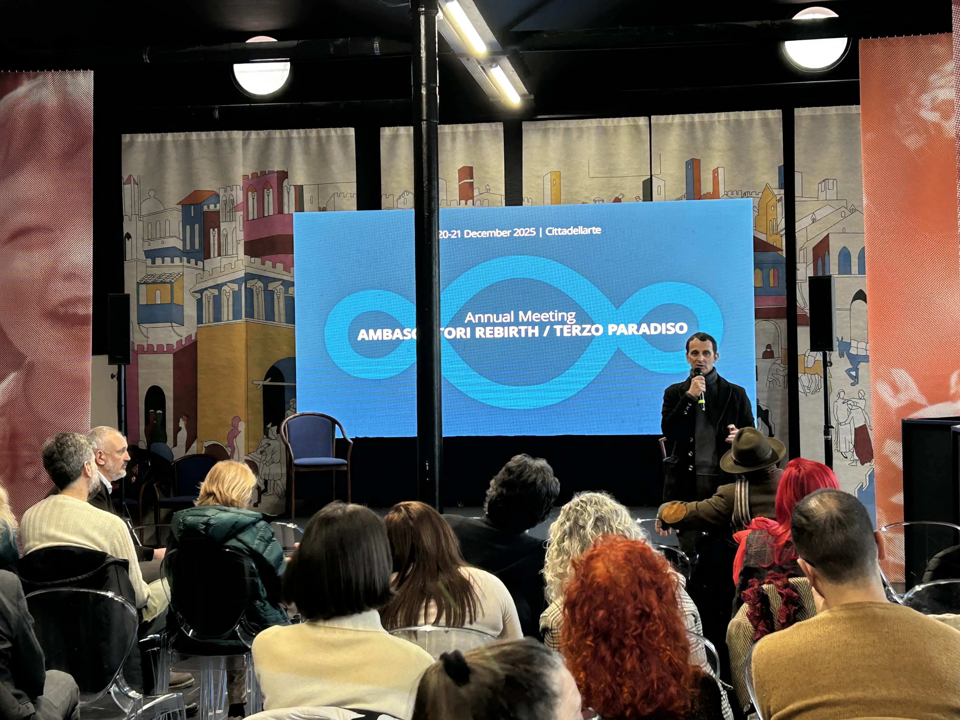 La mattina del sabato del meeting annuale degli Ambasciatori Rebirth/Terzo Paradiso si è aperta a Cittadellarte dando in primis spazio. Spazio fisico, innanzitutto, nel Palazzo del Buongoverno di Biella Città Arcipelago, ma soprattutto spazio politico, educativo e simbolico a pratiche che non si accontentano di essere raccontate, perché chiedono di essere riconosciute, condivise, strutturate. Collocato simbolicamente alla vigilia del Rebirth Day, l’incontro ha assunto fin dall’inizio il carattere di una soglia: tra fine e inizio, tra riflessione e azione, tra esperienze locali e orizzonti globali. Le parole che fin dal mattino si sono susseguite non hanno costituito un’unica narrazione lineare, ma una costellazione di traiettorie che trovano nel Terzo Paradiso un principio comune di equilibrio tra le differenze. A tracciare la prima non poteva che essere Francesco Saverio Teruzzi, coordinatore degli ambasciatori, che oltre ad aver alzato il sipario sull'evento e moderato gli interventi della mattinata, ha svolto un ruolo di regia e accompagnamento, tenendo insieme visione e operatività.