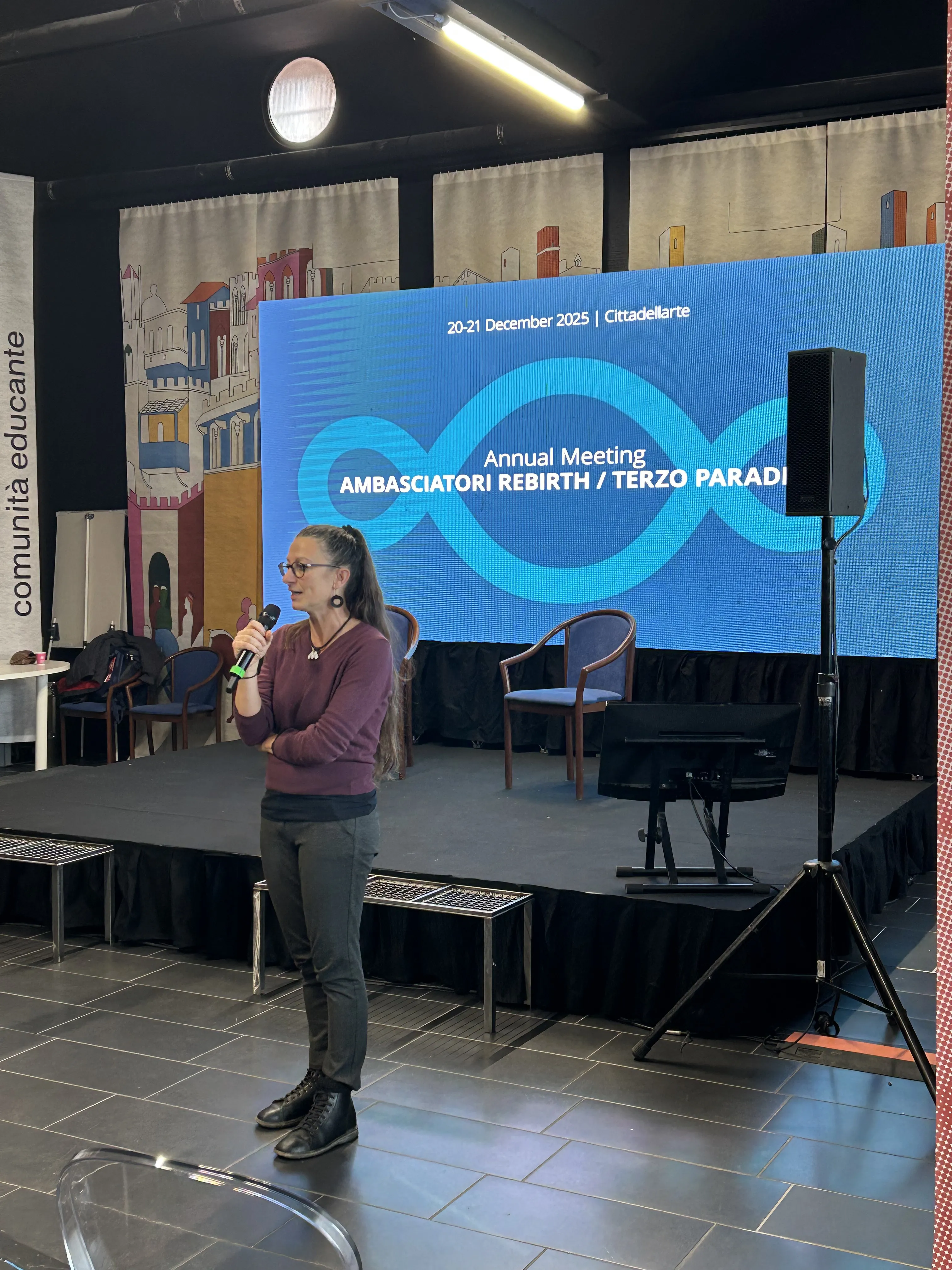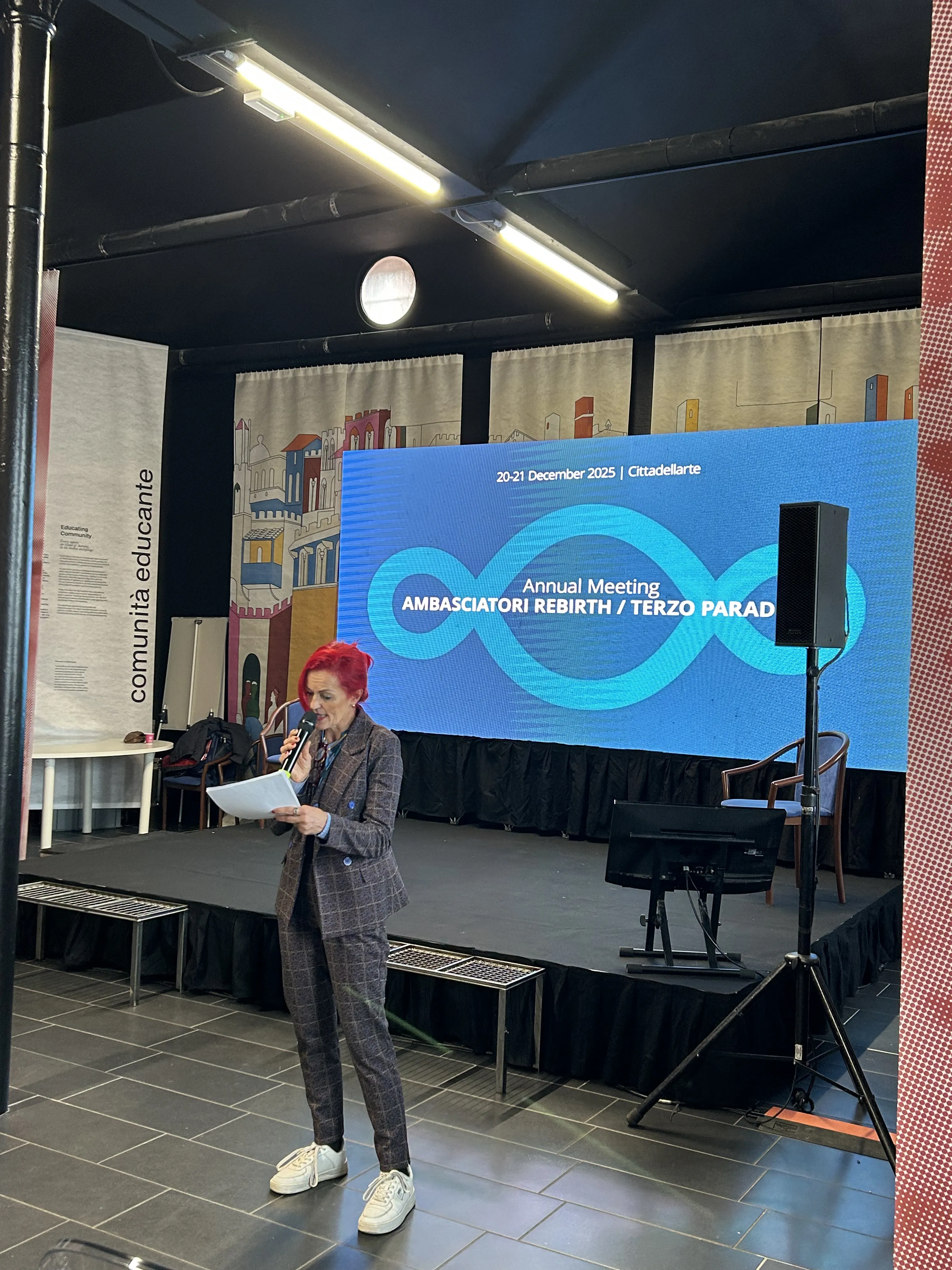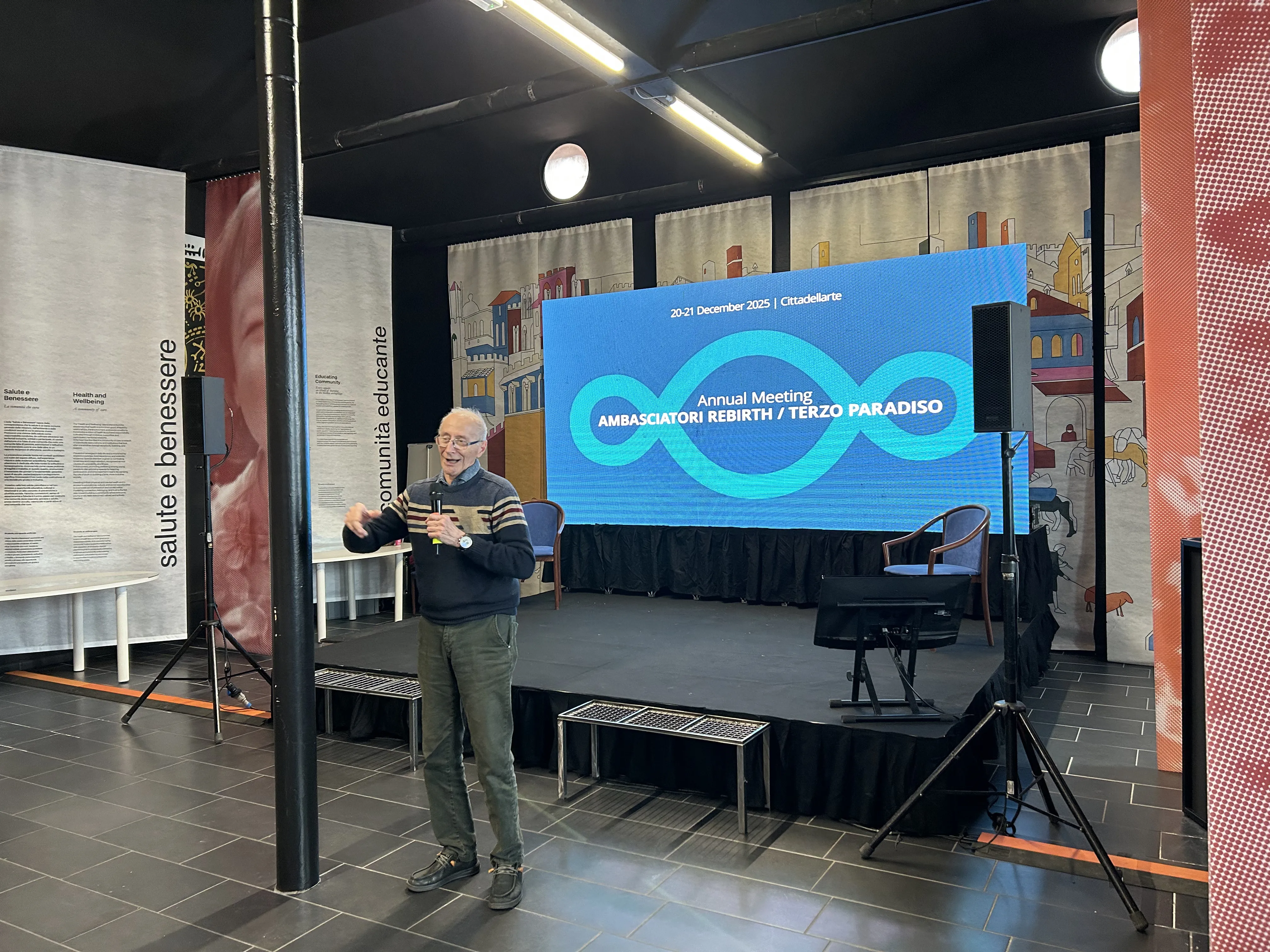 La mattina del sabato del meeting annuale degli Ambasciatori Rebirth/Terzo Paradiso si è aperta a Cittadellarte dando in primis spazio. Spazio fisico, innanzitutto, nel Palazzo del Buongoverno di Biella Città Arcipelago, ma soprattutto spazio politico, educativo e simbolico a pratiche che non si accontentano di essere raccontate, perché chiedono di essere riconosciute, condivise, strutturate. Collocato simbolicamente alla vigilia del Rebirth Day, l’incontro ha assunto fin dall’inizio il carattere di una soglia: tra fine e inizio, tra riflessione e azione, tra esperienze locali e orizzonti globali. Le parole che fin dal mattino si sono susseguite non hanno costituito un’unica narrazione lineare, ma una costellazione di traiettorie che trovano nel Terzo Paradiso un principio comune di equilibrio tra le differenze. A tracciare la prima non poteva che essere Francesco Saverio Teruzzi, coordinatore degli ambasciatori, che oltre ad aver alzato il sipario sull'evento e moderato gli interventi della mattinata, ha svolto un ruolo di regia e accompagnamento, tenendo insieme visione e operatività.
