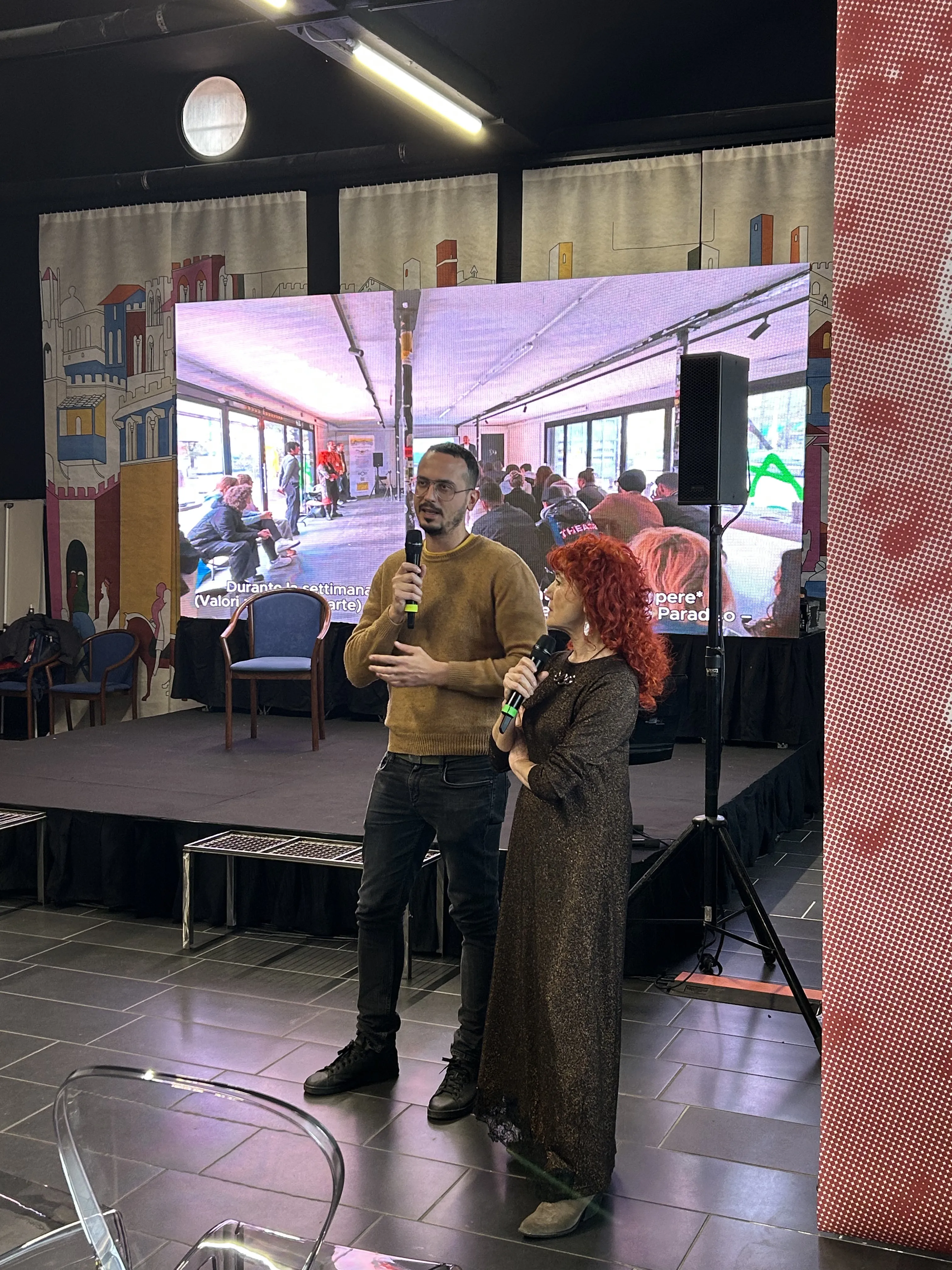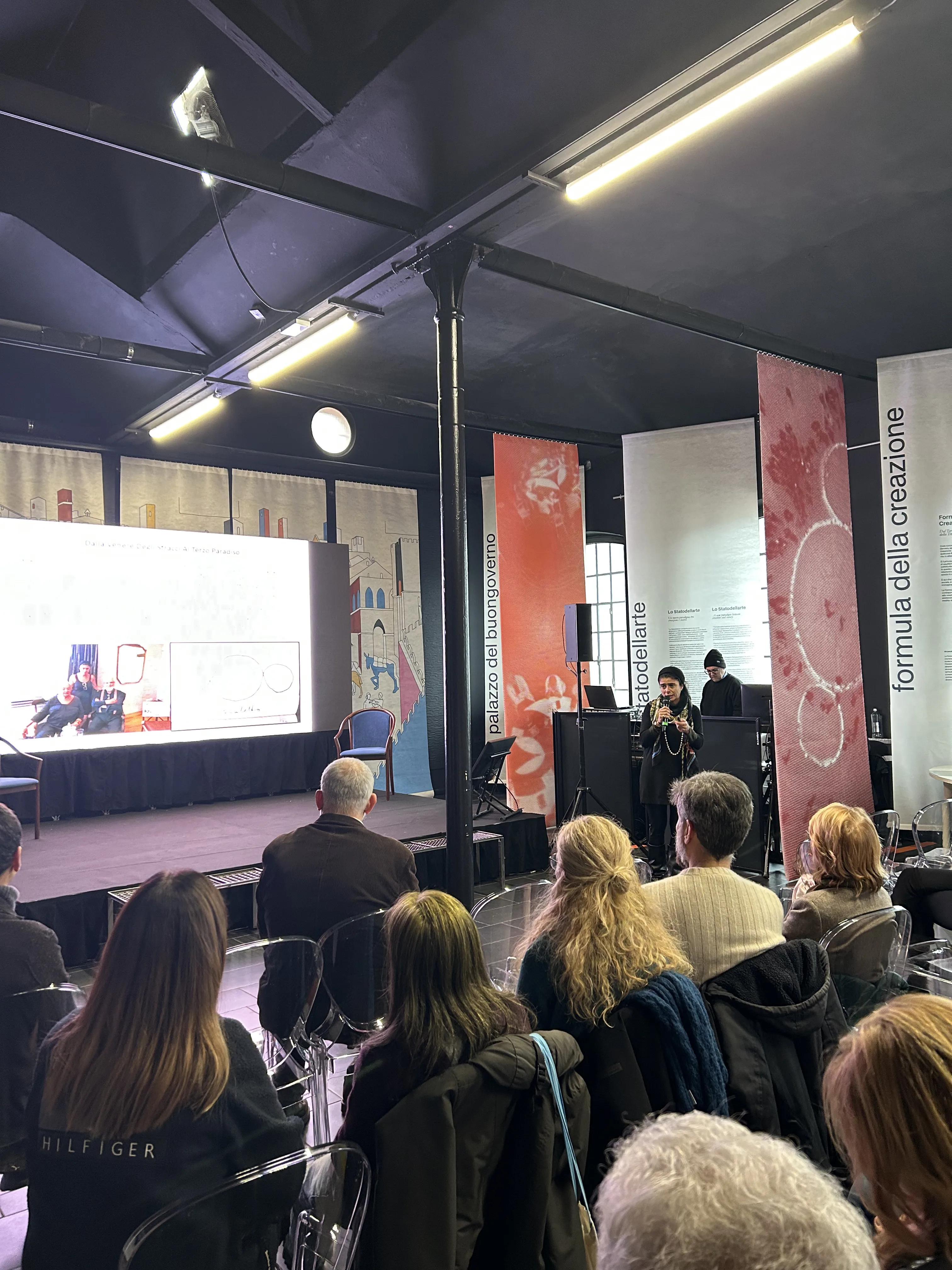 La mattina è continuata con l’intervento di Giacomo Bassmaji, che ha restituito il percorso che ha portato alla nascita dell’opera democratica di Gorizia–Nova Gorica, un progetto che affonda le sue radici già nel 2024, a partire dal forum nato durante la mostra T3rza Terra a Villa Manin. Da quel primo seme, il lavoro si è sviluppato fino a intrecciarsi con il 2025, anno in cui Gorizia e Nova Gorica sono diventate la prima Capitale Europea della Cultura transfrontaliera: un contesto simbolicamente potentissimo ma attraversato da fragilità storiche, politiche e relazionali. Bassmaji ha raccontato come l’arte sia stata chiamata a farsi gesto concreto di attraversamento, a partire dalla decisione di portare la Sfera di giornali oltre il confine, rifiutando ogni logica di separazione. La sfera, realizzata con scuole e studenti, è diventata così l’unico elemento capace di unire le due parate inaugurali, italiana e slovena, e il segno visibile di un processo che è poi proseguito per tutto l’anno con incontri, laboratori ed eventi. Il culmine è stato il forum di ottobre, tre giornate di confronto ospitate dall’Università di Gorizia, in cui cittadini, amministratori, organizzazioni e studenti hanno lavorato sui temi della vita comune, dall’urbanistica all’economia, dalla scuola allo sport. In questo contesto è nato il progetto di un Terzo Paradiso transfrontaliero, co-progettato dagli studenti universitari come sintesi dei diversi tavoli di lavoro: un’opera da realizzare in Piazza Transalpina, esattamente sul confine, utilizzando i materiali del muro abbattuto per trasformare la linea di separazione in uno spazio circolare di incontro. Bassmaji ha infine sottolineato come il processo abbia coinvolto oltre ottanta organizzazioni e importanti realtà imprenditoriali del territorio, mostrando come l’arte, quando si fa pratica collettiva, possa diventare uno strumento reale di riconciliazione, governance condivisa e costruzione di futuro.