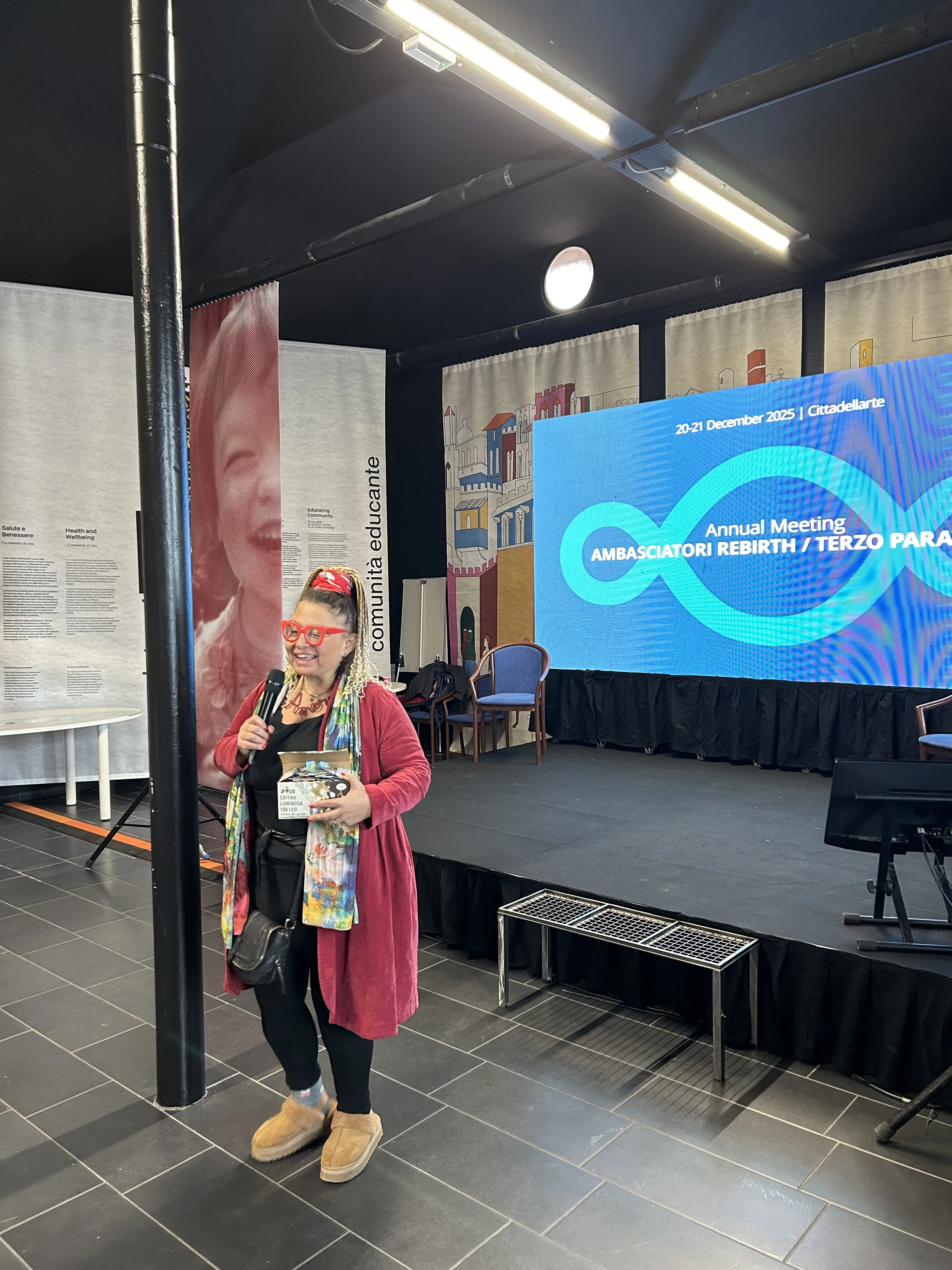 Dall'Ucraina si è passati al sud Italia con l’intervento di Linda Schipani. Il suo racconto ha intrecciato biografia e pratica artistica: dall’incontro con Michelangelo Pistoletto nel 2019 e la scoperta del simbolo del Terzo Paradiso, al ritorno nella sua "factory" a Messina, un ex stabilimento industriale trasformato in laboratorio creativo. "Iniziai a giocare nei magazzini col simbolo trinamico - ha raccontato - utilizzando materiali di scarto, sperimentando, sbagliando, imparando". Durante la pandemia, il Terzo Paradiso è diventato per lei anche strumento educativo, capace di generare domande e risposte. Il racconto personale di Linda ha attraversato il Rebirth Day, installazioni sullo Stretto di Messina, mostre collettive, fino all’organizzazione di una mostra interamente dedicata al Terzo Paradiso, con venti artisti, in un piccolo borgo storico come Santa Lucia del Mela, un progetto che ha unito territori, artisti e comunità.