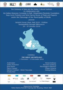 Ubud, grazie agli uffici della Direzione dell'Istituto Italiano di Cultura e alla collaborazione da esso promossa con organizzazioni locali (attive a livello sia territoriale sia globale), insieme a Kayu Lucie Fontaine, si trasforma così in uno dei luoghi del pianeta in cui si pratica la pace mondiale.