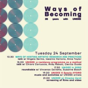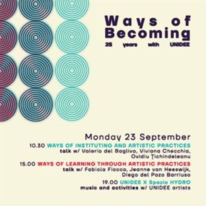 Lunedì 23 settembre La giornata prenderà il via alle 10:30 con il talk di due ore Modi di istituire attraverso le pratiche artistiche, che vedrà come relatori Valerio del Baglivo, Viviana Checchia e Ovidiu Țichindeleanu. Dalle 15:00 alle 17:00 spazio a un nuovo dialogo: Modi di apprendere attraverso le pratiche artistiche, con Fabiola Fiocco, Jeanne van Heeswijk e Diego del Pozo Barriuso. Dalle 19 alle 23 si concluderà la giornata con il consueto UNIDEE X Spazio HYDRO.