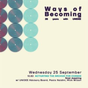 Mercoledì 25 settembre Mercoledì, dalle 10:30 alle 12:30, cala il sipario sulla rassegna con la conversazione conclusiva Attivare l’archivio per il cambiamento; per l'occasione interverranno l'UNIDEE Advisory Board (Andy Abbott, Beatrice Catanzaro, Alessandra Saviotti, Juan E. Sandoval), Paolo Naldini e Mick Wilson.