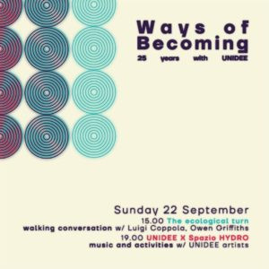 Domenica 22 settembre Nel pomeriggio, dalle 15:00 alle 17:00, è in programma La svolta ecologica, una camminata collettiva con partenza dal Museo del Presente con Luigi Coppola e Owen Griffiths nell’ambito di UNIDEE in città. Dalle 19:00 alle 23:00 UNIDEE X Spazio HYDRO: musica e attività con interventi di artisti e ospiti del Network UNIDEE Residency Programs.