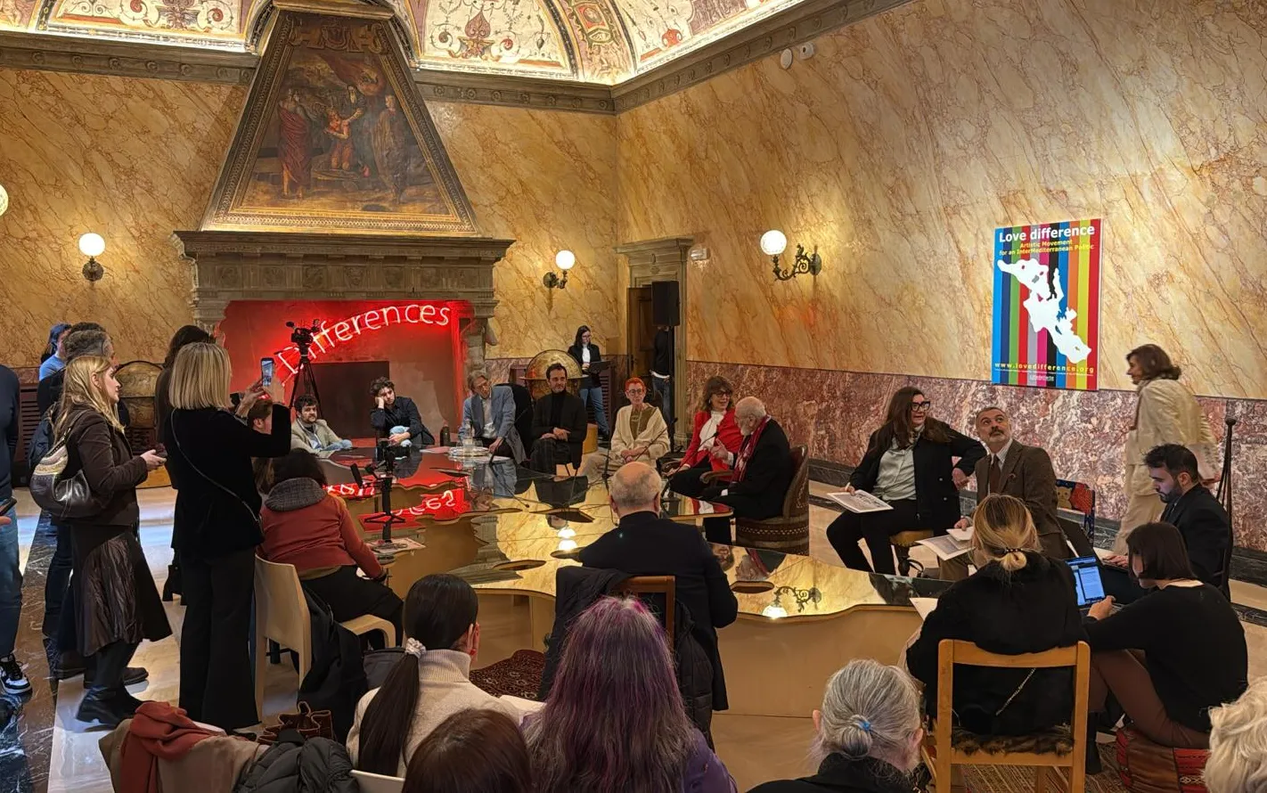 Il Tavolo del Mediterraneo, collocato nella Sala delle Udienze Papali, a Bologna ne è stato in qualche modo un centro simbolico e operativo. Sì, perché è andato oltre il ruolo oggetto da contemplare, ma è assurto a luogo di incontro, confronto e azione, destinato ad attivarsi ulteriormente attraverso un public program di conversazioni tematiche. È da qui, attorno a questo tavolo specchiante, che hanno preso parola i protagonisti della conferenza stampa, componendo un racconto polifonico che ha restituito il senso e la genealogia del progetto.