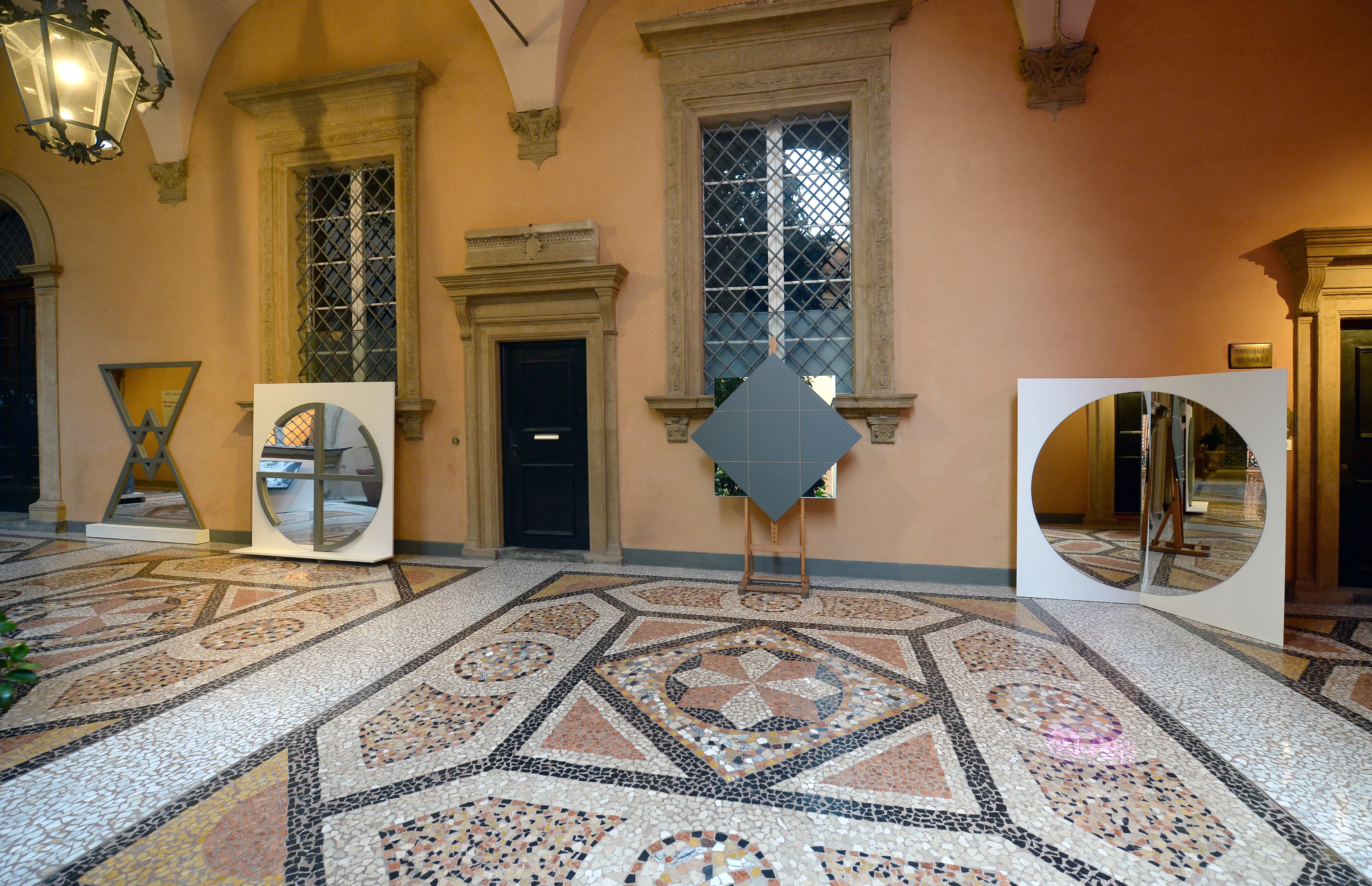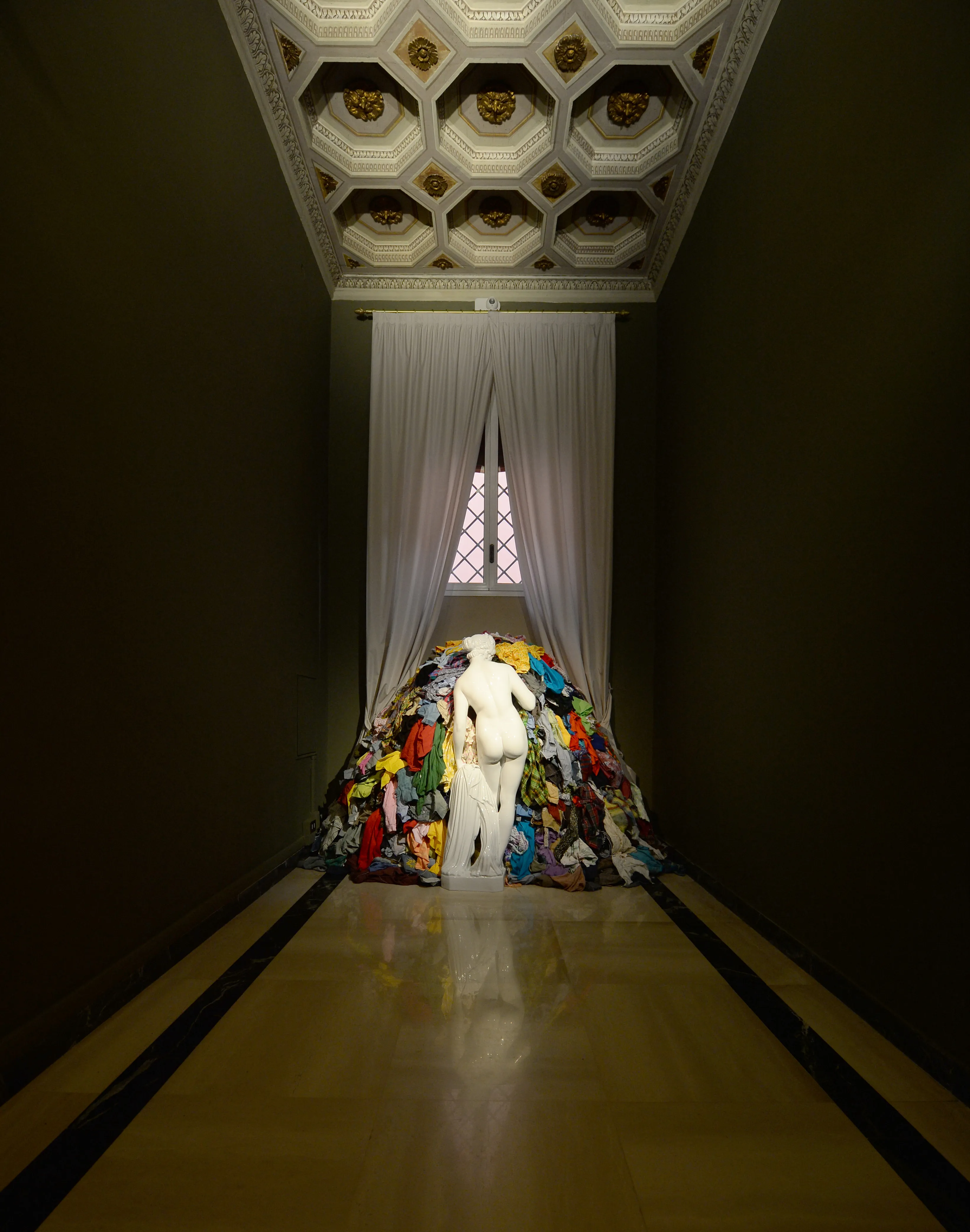Pizzighini Benelli ha ricordato come, quando propose per la prima volta questa nuova mostra a Pistoletto, un elemento risultò immediatamente decisivo: la figura di Papa Gregorio XIII e la sua ricerca sul tema del tempo. Un tema che, per l’artista, è strutturale, come dimostrano i suoi Quadri specchianti, in cui il presente si iscrive continuamente nell’opera. A questa prima connessione se ne è aggiunta un’altra, emersa successivamente, altrettanto potente: la scoperta che Gregorio XIII fu anche, in un certo senso, l’inventore della moda. Bologna, capitale della lana e della seta, vide nascere in quel contesto l’Università dei Sartori, con cui ancora oggi esiste un legame. Un filo storico e simbolico che conduce direttamente a La Venere degli Stracci, opera iconica presente in mostra, dove la bellezza classica si confronta con gli scarti della società, aprendo alla possibilità di una rinascita.