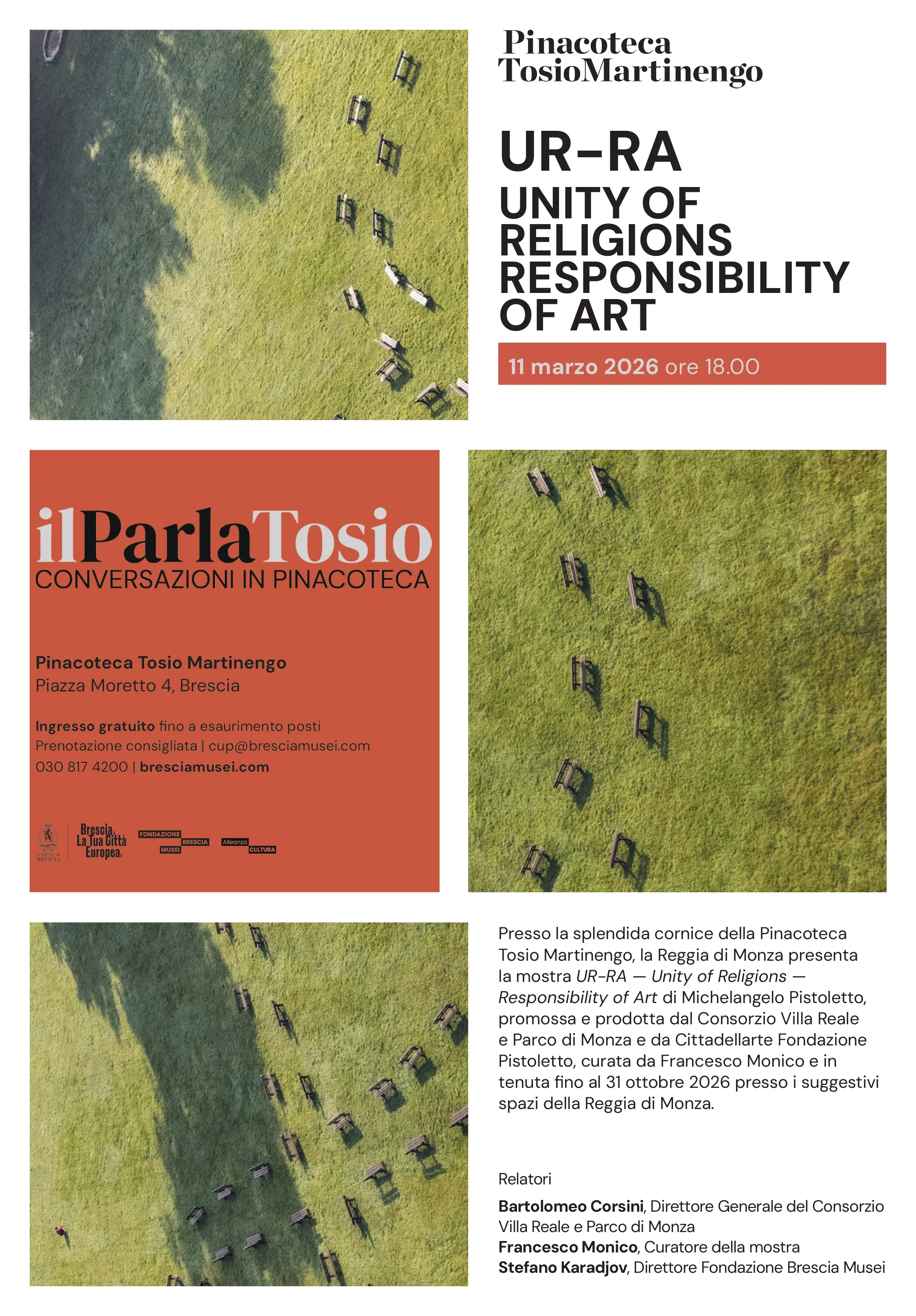 "L’incontro di Brescia nasce dal desiderio - ha esordito Francesco Monico, curatore della mostra UR-RA – Unity of Religions, Responsibility of Art e responsabile dell’Ufficio Spiritualità della Fondazione Pistoletto - di aprire il progetto UR-RA – Unity of Religions, Responsibility of Art a un dialogo pubblico con i luoghi della cultura. La mostra alla Reggia di Monza, dedicata al lavoro di Michelangelo Pistoletto, non è soltanto una ricognizione artistica, ma un dispositivo di pensiero che rimette in relazione arte e spiritualità. Come curatore della mostra e responsabile dell’Ufficio Spiritualità della Fondazione Pistoletto, considero questo progetto un laboratorio di confronto tra culture e tradizioni religiose, in cui l’arte torna a svolgere la sua funzione originaria: creare lo spazio simbolico - ha concluso - in cui l’umanità può interrogare se stessa e immaginare un nuovo mondo".
