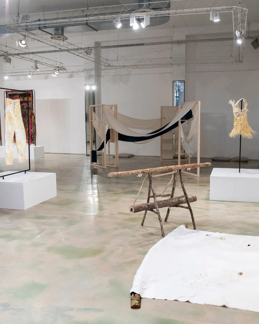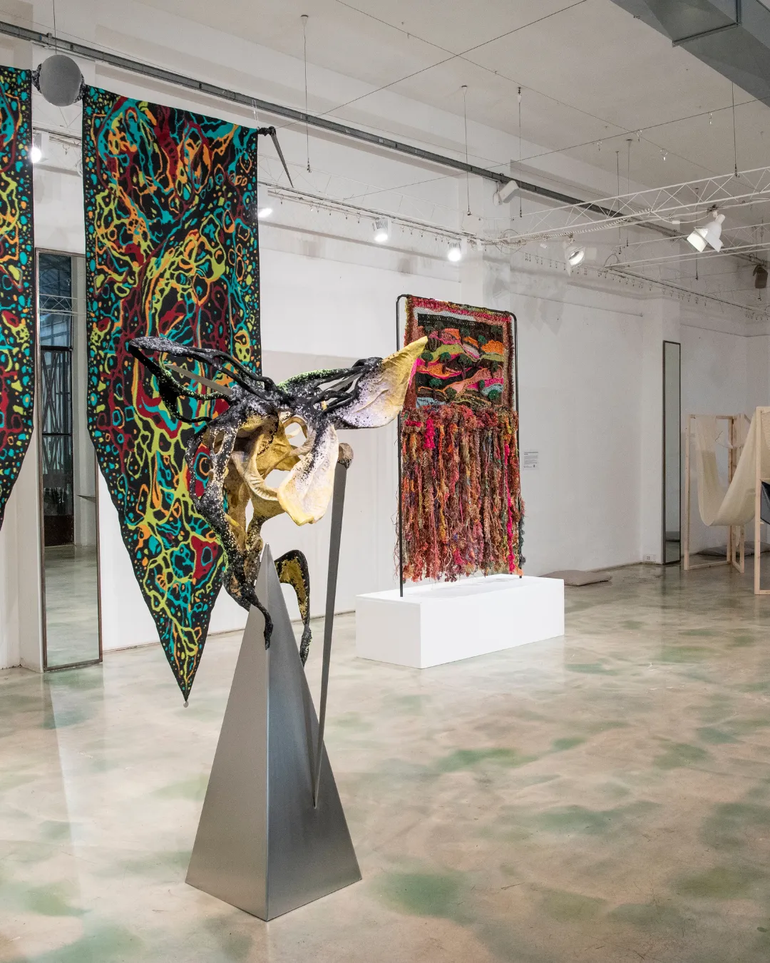 Scopriamo ora le opere esposte, cominciando da Hopeful Monsters. Serendipity in Saltational Evolution di Camilla Alberti. Il lavoro indaga la trasformazione della materia attraverso materiali di riciclo e pigmenti organici. Scultura e tessuti Jacquard nascono da fibre, polveri e colori ottenuti da scarti industriali e naturali. L’imperfezione e il decadimento diventano risorse creative, rappresentando uno spazio di coesistenza tra specie e tempi diversi, dove la materia si rigenera e assume un nuovo significato estetico e simbolico.