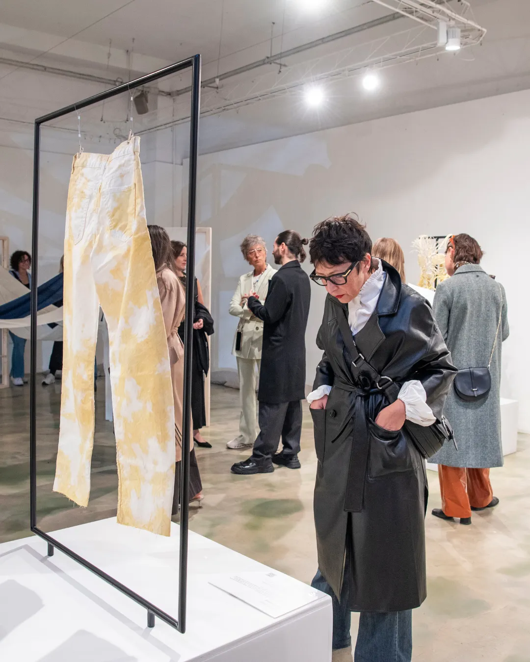 Il terzo progetto è quello di Piero D’Angelo, che esplora la tintura con lo slime mould, un organismo capace di generare pigmenti in modo continuo, simile a un lievito madre. L’opera Pigmenti Viventi è un abito/scultura - realizzato con fibre naturali e rigenerative come la lana e il lino - che richiama i motivi organici dello slime mould in crescita. Inoltre, è stato realizzato un jeans tinto con lo slime mould, a dimostrazione che questo approccio non è solo una sperimentazione artistica, ma può trasformarsi in un linguaggio applicabile alla moda di tutti i giorni.