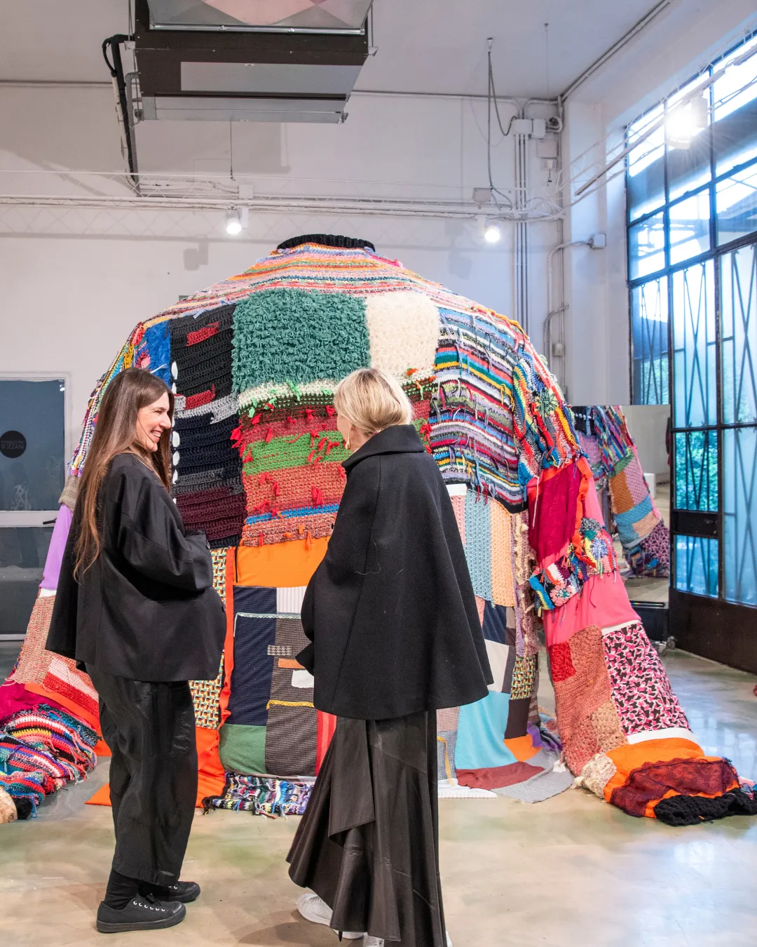 Si passa poi a Martina Boero con il suo brand Cavia, che ha realizzato The White Inside, un maglione monumentale realizzato con scarti, filati e tessuti di fine serie. Il suo esterno pesante e composto a patchwork riflette il peso della moda e dell’eccesso, mentre un vuoto nascosto all’interno invita i visitatori a entrare in uno spazio bianco e silenzioso. L’opera mette in contrasto il peso e la speranza, mostrando come da rifiuti e vincoli possa emergere una possibilità delicata di rinnovamento, ponendosi come un rifugio fiabesco in cui la pesantezza lascia spazio alla leggerezza.