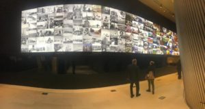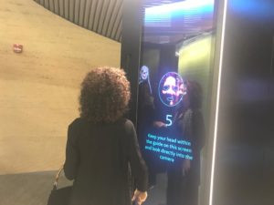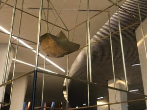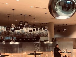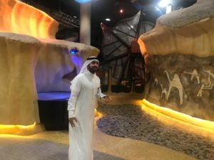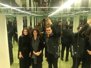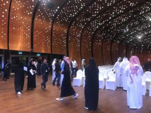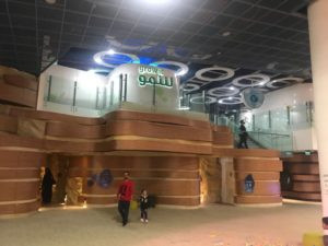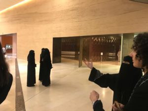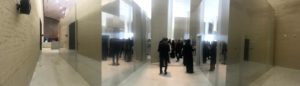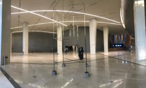 Ci accoglie una hall che richiama la piazza. Una foresta luminosa di colonne di cemento, altissime pareti di sabbia e pietrisco pressati, colonne di legno lamellare alte 20 metri, installazioni artistiche, un enorme ingresso verso il Children's Museum, e poi la mostra MARA'INA, che significa 'i nostri specchi'. E nella prima un quadro specchiante di Michelangelo Pistoletto, la ragione del nostro viaggio, in effetti. Iole Persano di Galleria Giorgio Persano ha curato la commissione da parte di Ithra di un'opera di Michelangelo dedicata alla società saudita contemporanea.
