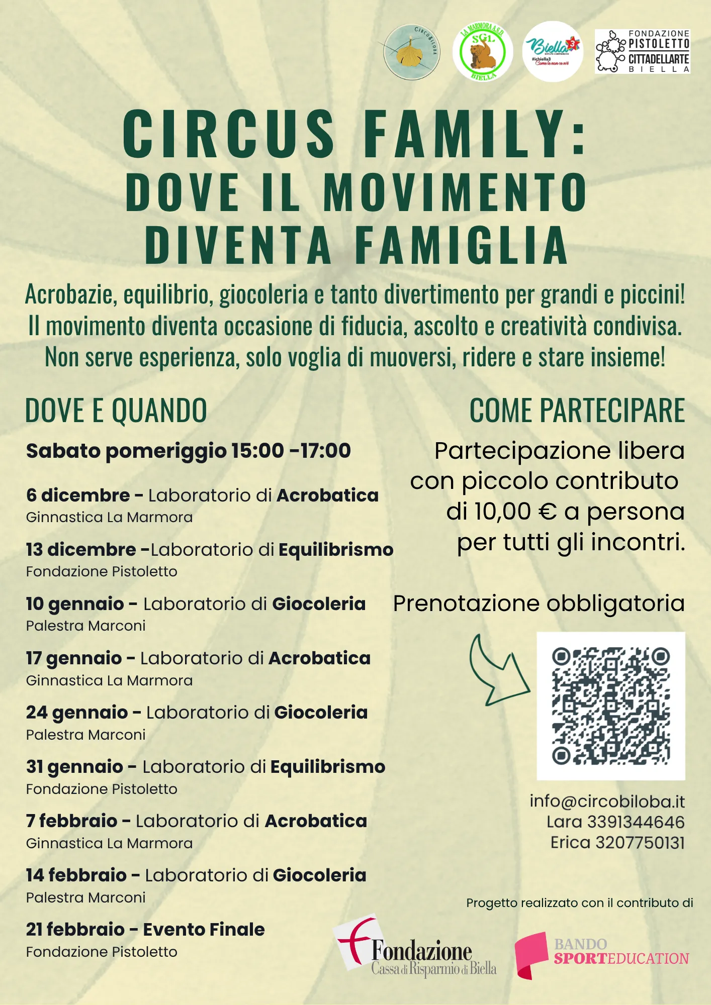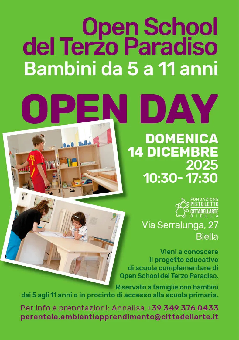 Sono quattro le iniziative organizzate nel contesto dell'Ufficio Ambienti. La prima sarà il 13 dicembre dalle 15 alle 17 al Palazzo del Buongoverno, dove si terrà Circus Family: Dove il divertimento diventa famiglia, un laboratorio di equilibrismo riservato alla coppia bambino-adulto (al costo di 10 euro) a cura di Circo Biloba in collaborazione con Fondazione Pistoletto, con il sostegno di Fondazione CRB all'interno del bando Sport education. La seconda proposta sarà, per il 14 novembre, il mercatino degli alunni dell'Open School del Terzo Paradiso, aperto fino alle 12:30/13:00 in sala moda, con tanto di esibizione pomeridiana degli studenti alle 15:00 con open song e esibizioni circensi aperte a tutti. Nello stesso giorno è in programma anche l'Open Day dell'Open School dalle 10.30 alle 17.30, rivolto a famiglie con bambini dai 5 agli 11 anni o in procinto di accesso alla scuola primaria. Per info e prenotazioni: Annalisa 3493760433 - parentale.ambientiapprendimento@cittadellarte.it. Sarà infine possibile prendere parte a L'Arte Vien Giocando curato da Luz J. Carollo, dalle 14:30 alle 16:30 al costo di 5 euro a bambino.