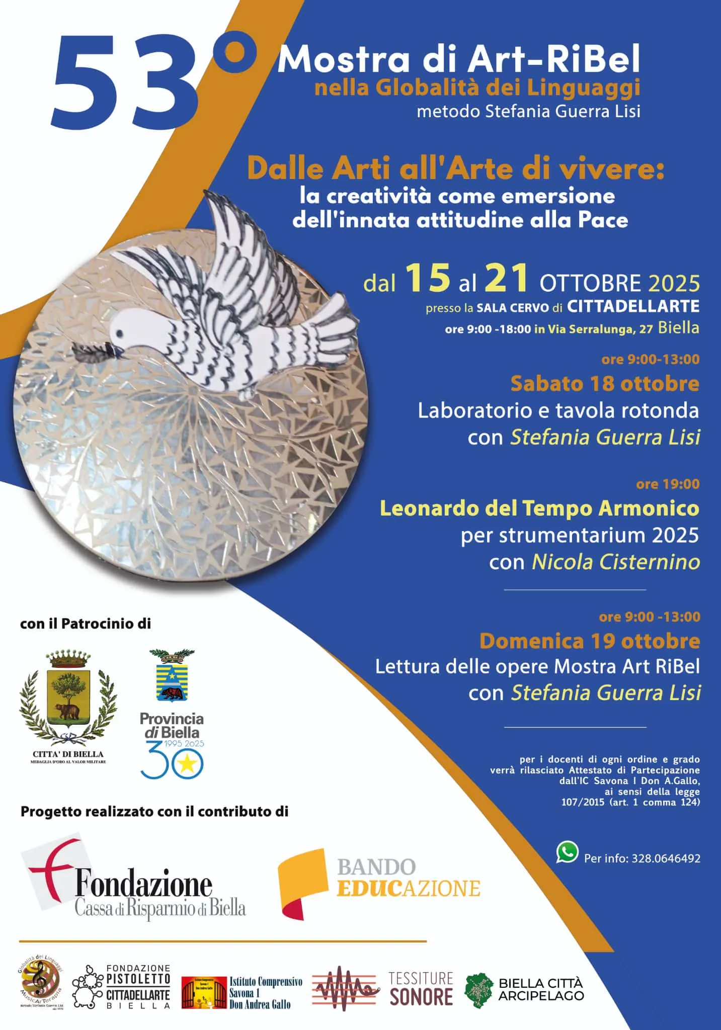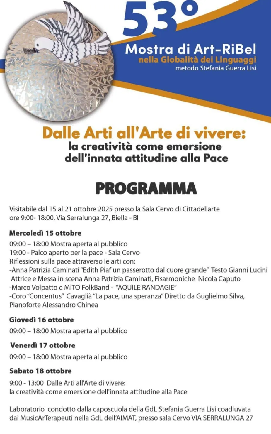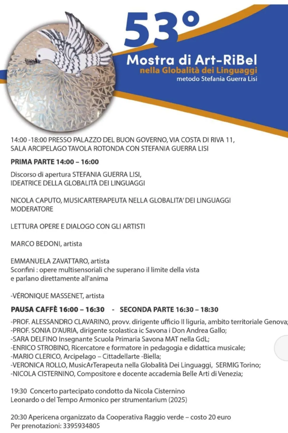 Sabato 18 ottobre sono previste numerose attività: si parte la mattina, dalle 9:00-13:00 in Sala Cervo, con il laboratorio Dalle Arti all'Arte di vivere: la creatività come emersione dell'innata attitudine alla Pace, condotto dalla caposcuola Stefania Guerra Lisi (oltre che ambasciatrice Rebirth/Terzo Paradiso) coadiuvata dai MusicArTerapeuti nella Globalità dei Linguaggi dell'AIMAT. Dalle 14 alle 18 ci si sposterà al Palazzo del Buongoverno in Costa di Riva 11, dove, presso la Sala Arcipelago, si terrà una tavola rotonda con Stefania Guerra Lisi, moderata da Nicola Caputo. Dopo il discorso di apertura di Lisi, è prevista la lettura delle opere con il dialogo con gli artisti fino alle 16; interverranno, nello specifico, gli artisti Marco Bedoni, Emmanuela Zavattaro, Véronique Massenet. Dopo la pausa caffè, dalle 16.30, spazio ai seguenti relatori: professor Alessandro Clavarino (dirigente ufficio Il Liguria, ambito territoriale Genova); professoressa Sonia D'Auria (dirigente scolastica dell'Istituto Comprensivo Savona I Don Andrea Gallo); Sara Delfino (insegnante della Scuola Primaria Savona MAT nella Globalità dei Linguaggi); Enrico Strobino (ricercatore e formatore in pedagogia e didattica musicale); Mario Clerico (per Biella Città Arcipelago), Veronica Rollo (MusicArTerapeuta nella Globalità Dei Linguaggi, SERMIG Torino); Nicola Cisternino (compositore e docente accademia Belle Arti di Venezia). Quest'ultimo si esibirà poi alle 19.30 nel concerto Leonardo o del Tempo Armonico per strumentarium (2025). La giornata si concluderà con un apericena organizzato dalla Cooperativa Raggio verde (costo 20 euro, prenotazioni al 3395934805).