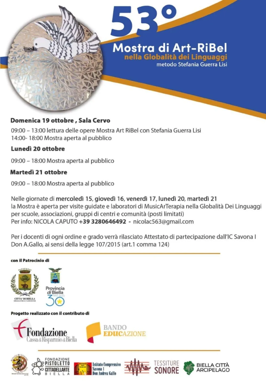 Nelle giornate di mercoledì 15, giovedì 16, venerdì 17, lunedì 20, martedì 21 la mostra sarà aperta per visite guidate e laboratori di MusicArTerapia nella Globalità Dei Linguaggi per scuole, associazioni, gruppi di centri e comunità (posti limitati). Per tutte le informazioni è possibile contattare Nicola Caputo al +39 3280646492 o via mail all'indirizzo nicolac563@gmail.com. Per i docenti di ogni ordine e grado verrà rilasciato Attestato di partecipazione dall'IC Savona I Don A.Gallo (ai sensi della legge 107/2015, art.1 comma 124).