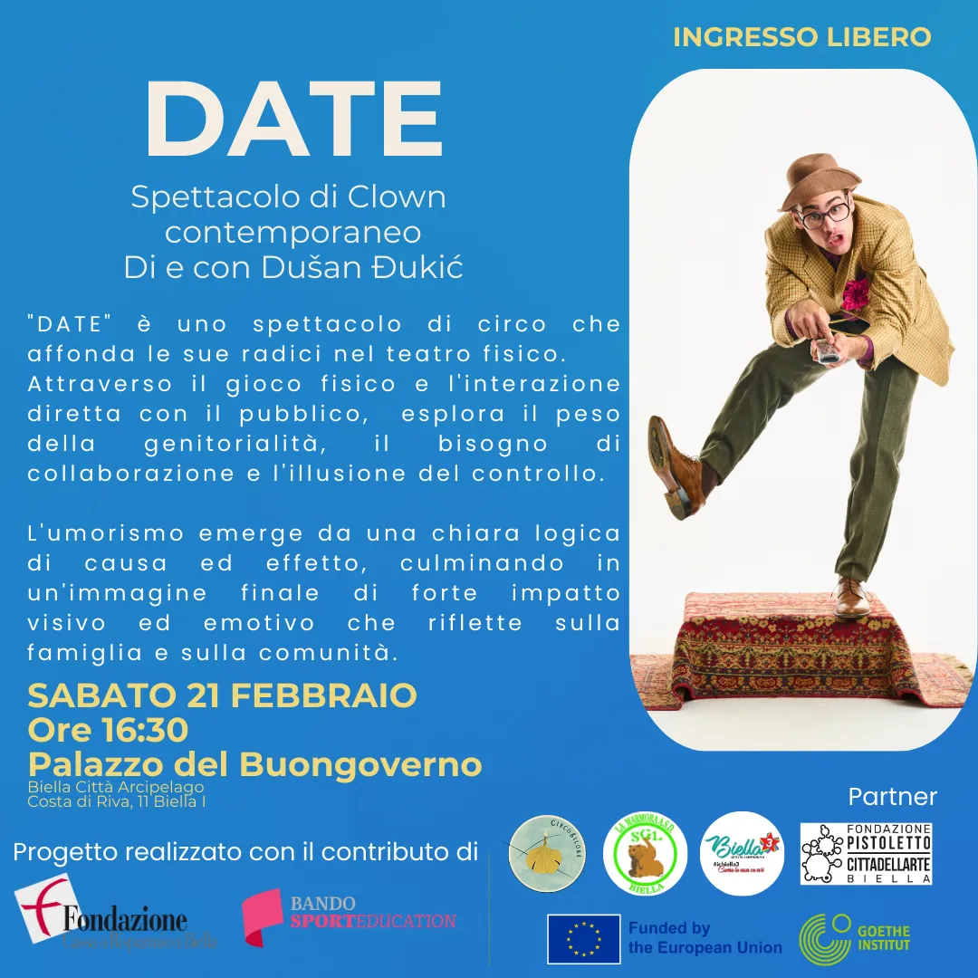A seguire, dalle 16.30, è previsto lo spettacolo dell’artista montenegrino Dušan Đukić, protagonista di un lavoro di clown contemporaneo dal titolo DATE. Si tratta di uno spettacolo di circo che affonda le sue radici nel teatro fisico: "Attraverso il gioco corporeo e l’interazione diretta con il pubblico - si legge nell'apposita presentazione - esplora il peso della genitorialità, il bisogno di collaborazione e l’illusione del controllo. L’umorismo nasce da una chiara logica di causa ed effetto, fino a culminare in un’immagine finale di forte impatto visivo ed emotivo, che invita a riflettere sul significato di famiglia e comunità". Lo show è sostenuto dall’Unione Europea e implementato dal Goethe-Institut.