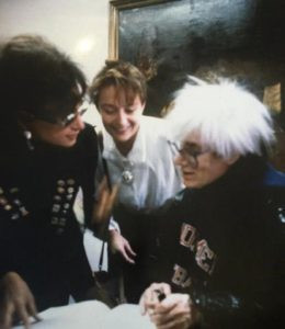 Manuela Gandini con Andy Warhol e Daniela Morera, Milano 1987.