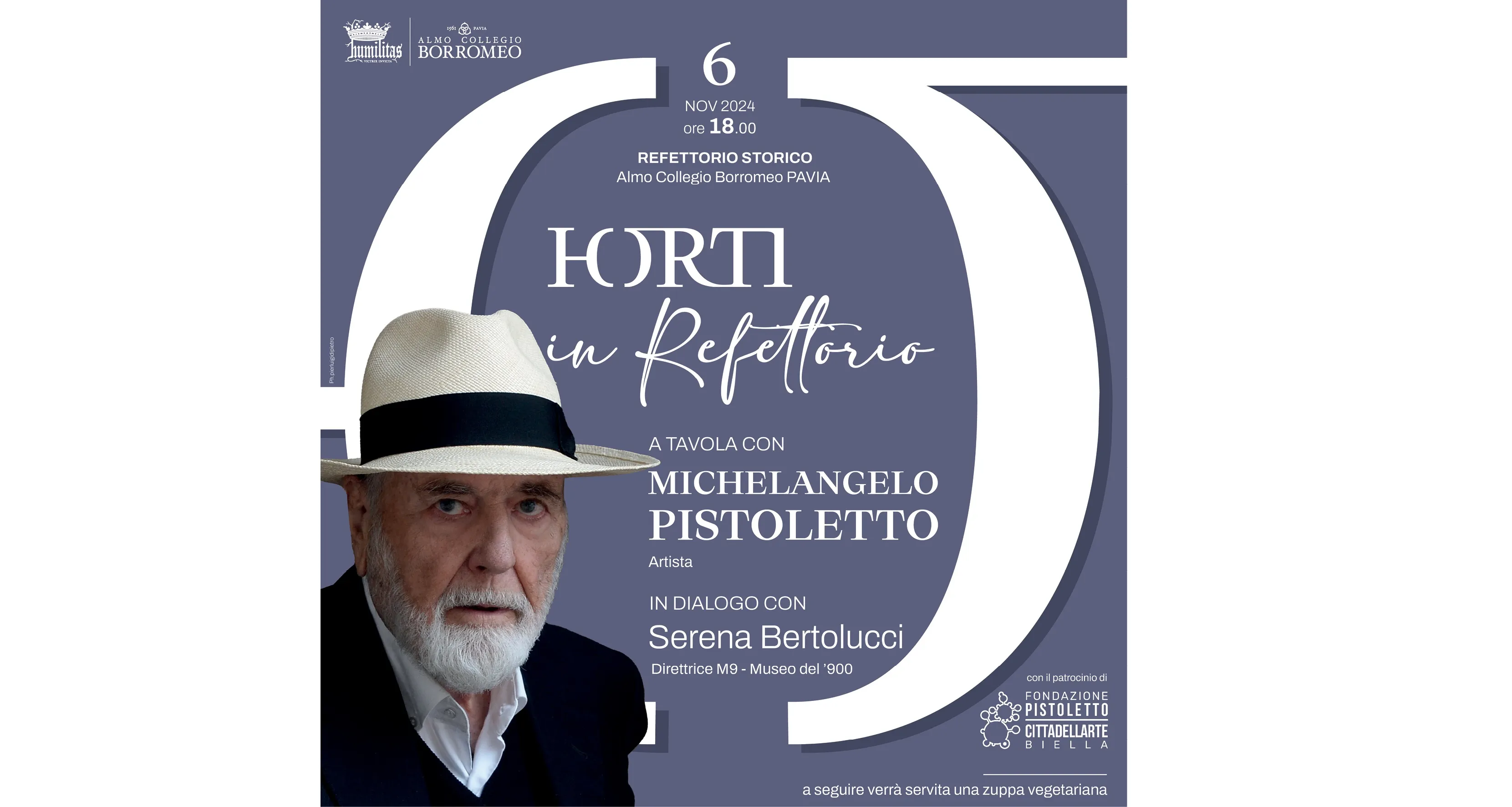 Quando un refettorio diventa un luogo d'incontro solidale tra convivialità e creatività: mercoledì prossimo al Collegio Borromeo di Piazza Borromeo 9 a Pavia, nella suggestiva sala da pranzo che ogni giorno - e da più di 500 anni! - accoglie alunni, studenti del master e docenti, ospiterà il primo evento del format Horti in Refettorio, un ciclo di incontri tra arte, architettura, valorizzazione dei beni culturali, design, scrittura e poesia che porrà sotto i riflettori protagonisti del mondo della cultura, nella cornice del cinquecentesco Refettorio, luogo di grande fascino reso accessibile al pubblico per la prima volta. Alle ore 18 andrà in scena l'appuntamento, organizzato con il patrocinio di Cittadellarte, che vedrà come protagonista Michelangelo Pistoletto, “esponente dell’Arte Concettuale e dell’Arte Povera - questa la presentazione degli organizzatori -, uno degli artisti più significativi del panorama artistico contemporaneo italiano e internazionale”.