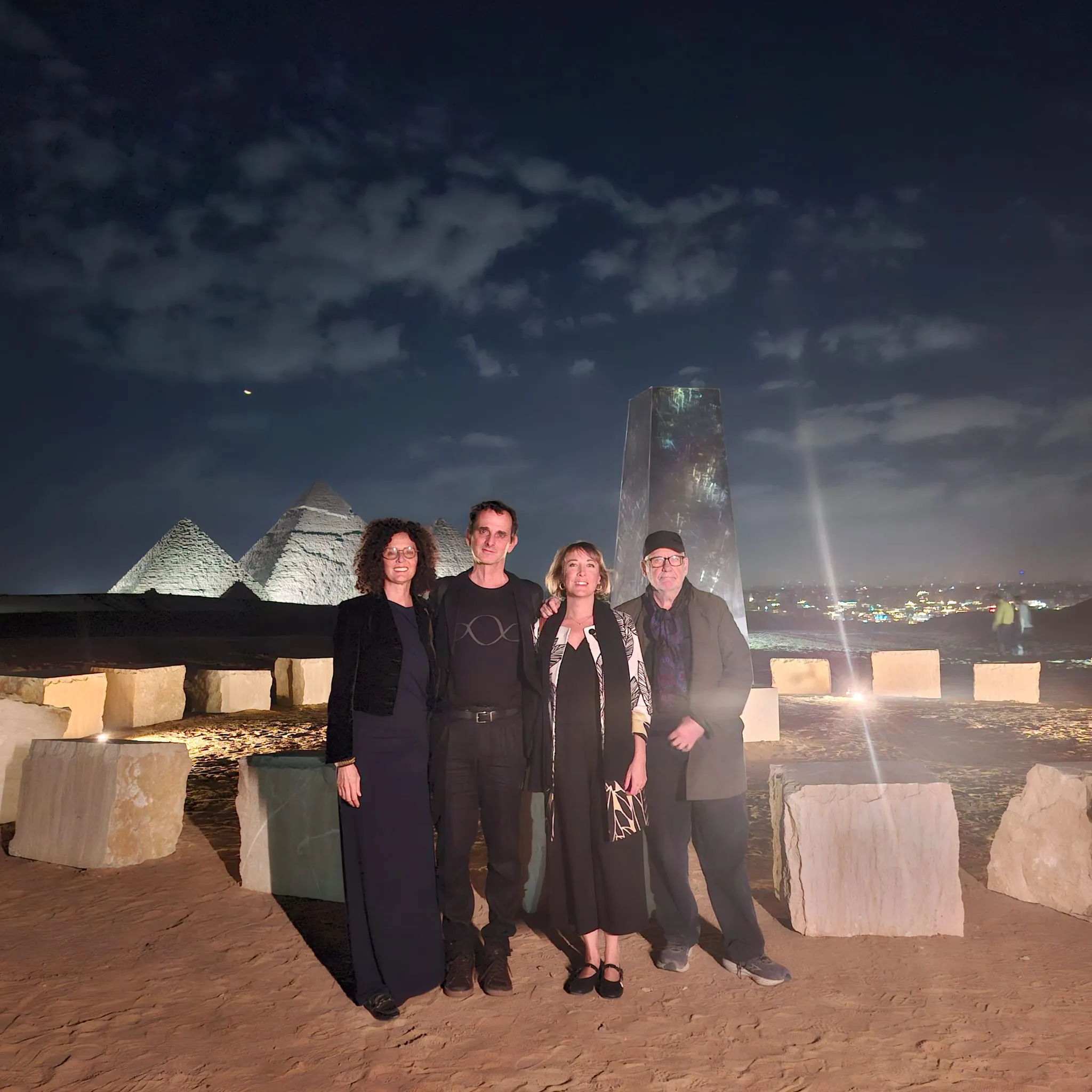 Paolo Naldini, in Egitto da venerdì scorso insieme ad Armona Pistoletto, presidente di Let Eat Bi, Emanuele Montibeller, Consigliere di Cittadellarte, e Marina Maffei, Executive and Organizational Management di Cittadellarte (sopra la foto di gruppo), è stato e sarà protagonista di numerose interviste (un esempio nell'immagine di copertina), oltre che di lectures e talk dedicati all'opera. Oggi, per esempio, si terrà al Cairo dalle 15 alle 19 l'incontro Immortality and Continuity — The Legacy of Tomorrow curato da Art D'Égypte che si articolerà attraverso una serie di speech che indagheranno le opere di Forever is now attraverso le voci dei protagonisti. Uno dei quattro panel, quello intitolato Echoes of Myth and Modernity, in programma dalle 17.55 alle 18:55 (ora locale), vedrà fra i relatori Paolo Naldini. Il direttore di Cittadellarte, che interverrà insieme a David Solid Nature e Salha El Masry, sarà invitato a esplorare la ricerca umana di continuità spirituale, ritualità e rinascita, collegando il simbolismo mitico all’espressione contemporanea, nel suo caso in riferimento al simbolo trinamico. Naldini, inoltre, offrirà una serie di riflessioni attorno a quattro domande chiave: "In che modo affronti le dualità mitiche o spirituali nel tuo lavoro? Come si manifestano le narrazioni antiche nel tuo linguaggio artistico? Come vedi il ruolo dell’artista come ponte tra mito e modernità? In che modo la tua installazione invita a riflettere sul tempo e sulla rinascita?". Il direttore, oltre a dare il proprio sguardo sulle questioni chiave del confronto, si focalizzerà anche sulla collaborazione tra Cittadellarte e l'Istituto Italiano di Cultura Il Cairo: in occasione di Forever Is Now, Accademia Unidee ha infatti assegnato, insieme all’Istituto in questione, due borse di studio rivolte a giovani talenti egiziani. I vincitori – Mohamed Ahmed Hassan Shoeb per l’Arte Contemporanea e Rawan Emad Omar Elfarouk Mohamed Soliman per la Moda Sostenibile – sono stati selezionati tra numerose candidature per la loro capacità di interpretare i valori fondanti del percorso di Michelangelo Pistoletto e Cittadellarte: il ruolo dell’arte come motore di cambiamento sociale e la sostenibilità come principio guida della creatività.