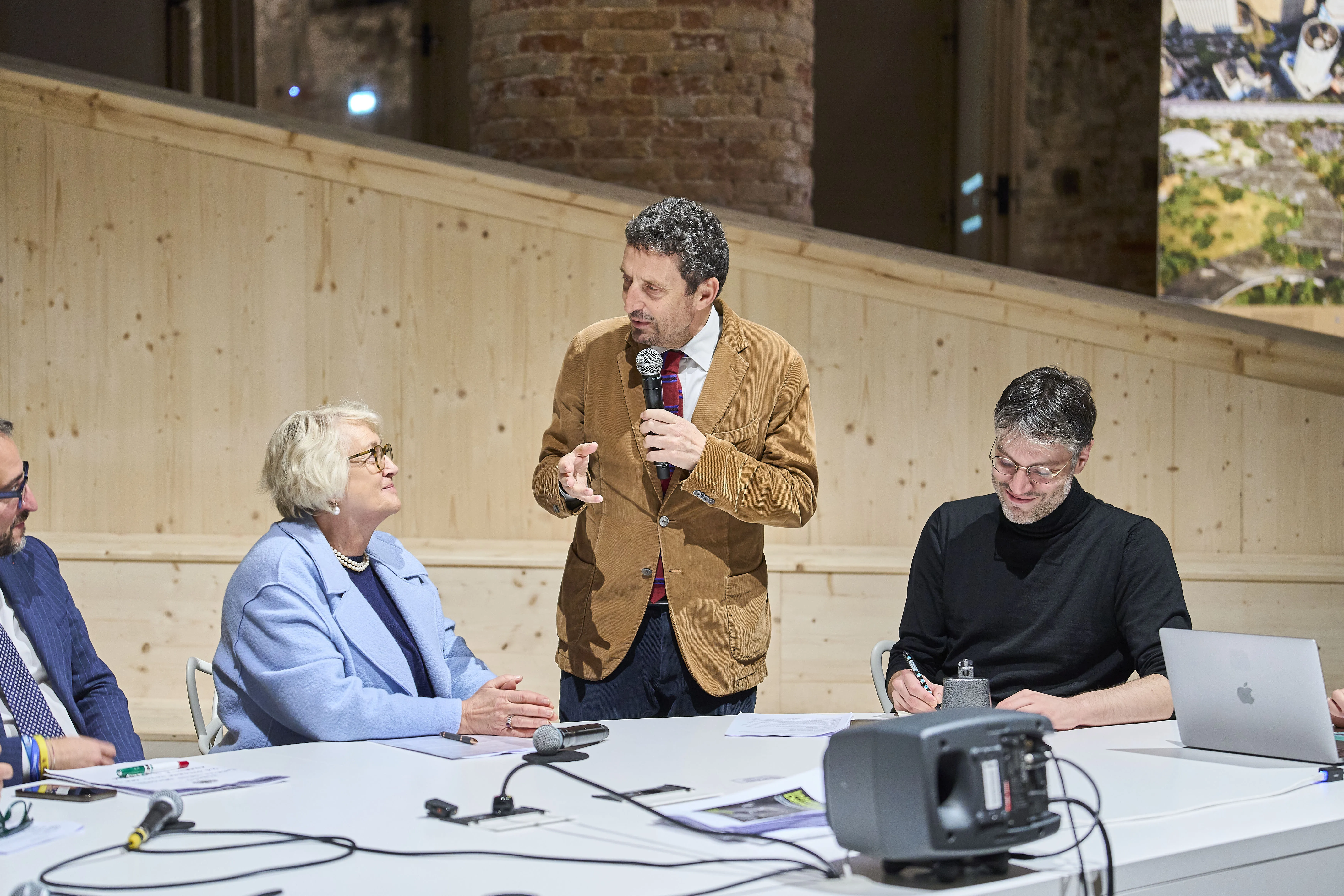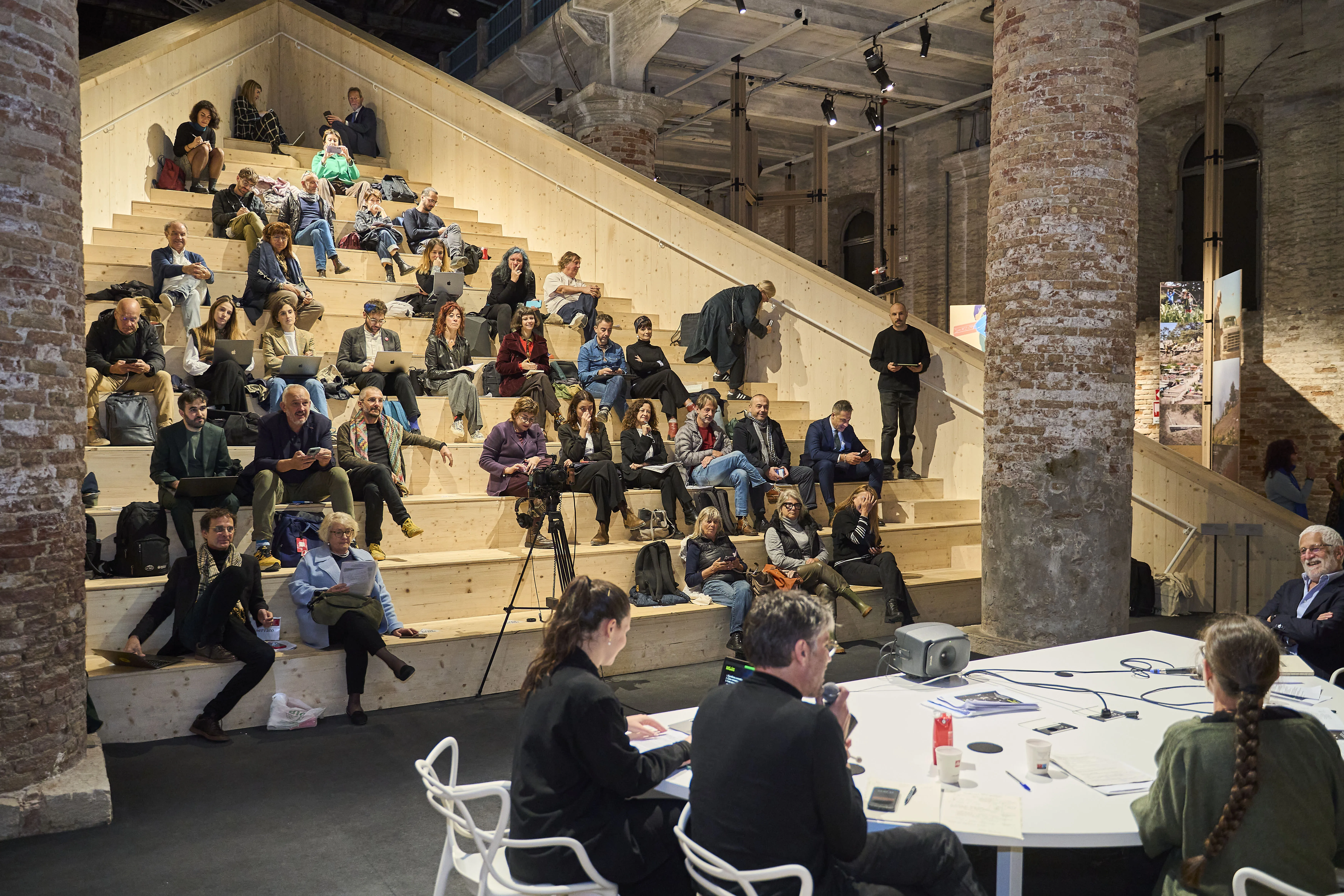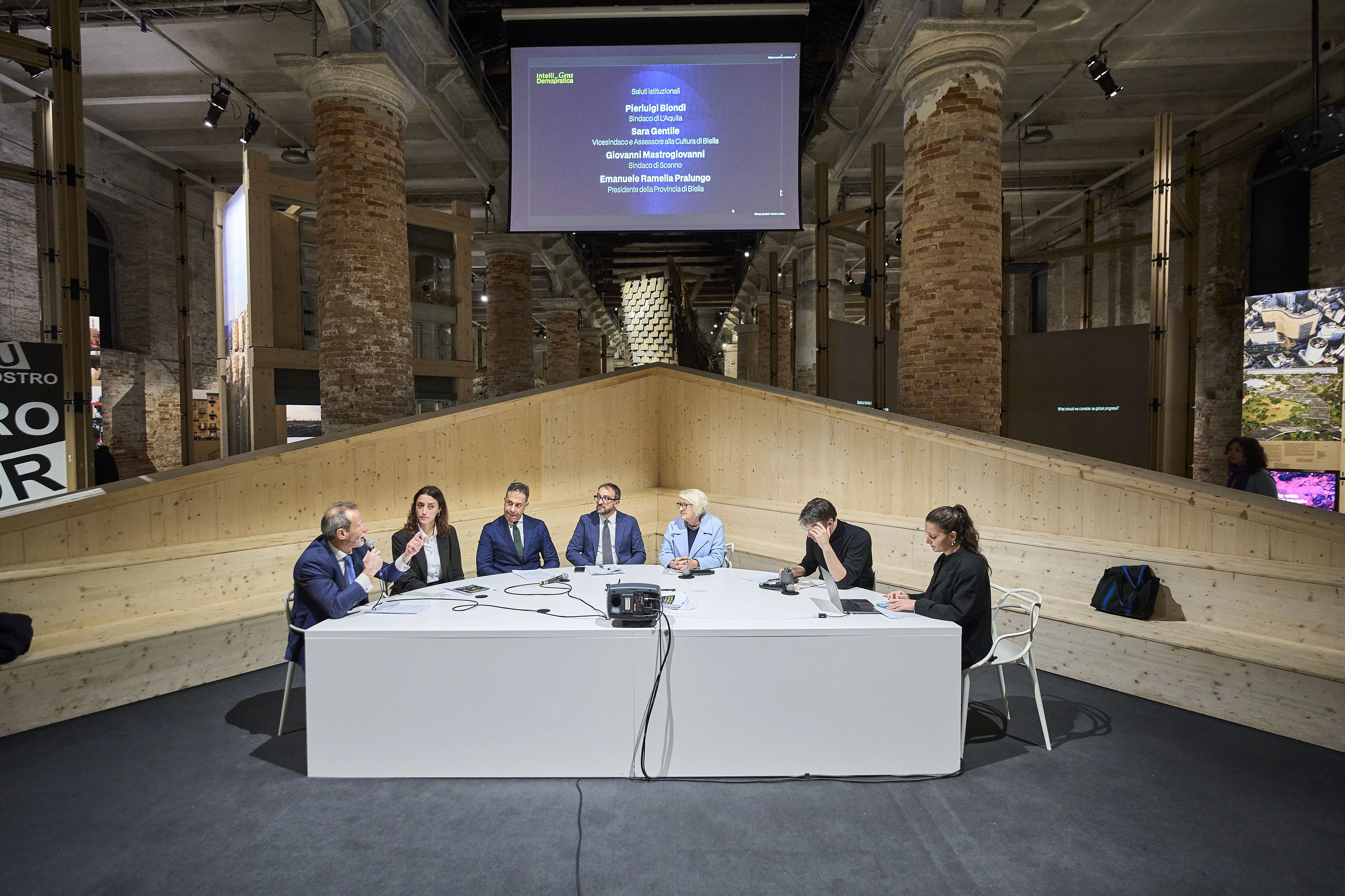 Come da programma, ha poi raggiunto i relatori il presidente della Fondazione La Biennale di Venezia Pietrangelo Buttafuoco, che ha offerto una riflessione sul significato dello Speakers’ Corner, spazio voluto dal curatore Carlo Ratti per ospitare momenti di dialogo e confronto all’interno della Biennale. “Questo luogo mi esalta – ha affermato – perché permette che ciò che viene mostrato e raccontato, anche in forma di predizione, diventi esperienza viva dei saperi e delle competenze, generando un confronto continuo. È proprio questo esercizio della praxis che conduce ciascuno di noi verso una consapevolezza interiore”. Buttafuoco ha poi ampliato la sua riflessione al rapporto tra memoria, politica e comunità, sottolineando come camminare nelle città significhi immergersi in una memoria collettiva, in un tessuto di esperienze che unisce passato e presente. Richiamando la dimensione del politico come pratica quotidiana, ha poi riconosciuto la fatica degli amministratori, chiamati a misurarsi con l’immanenza dell’opinione pubblica e a orientarla verso una prassi costruttiva. “È un esercizio ingrato – ha aggiunto – quello di saper orientare l’opinione pubblica verso un fare condiviso, una prassi che costruisca davvero comunità.” Da questa riflessione è emerso un invito alla trasformazione dei cittadini in comunità pensante, capace di unire sentimento e ragione. Buttafuoco ha citato l’esempio di L'Aquila, città simbolo di rinascita e coesione dopo i terremoti che l'hanno colpita, dove “il sentimento pensante ha generato una nuova consapevolezza nel rapporto con la natura e con la politica”. Il suo intervento si è chiuso con una provocazione densa di significato, che suona come un monito e una visione: “Meno avvocati, più ingegneri”. Una frase che sintetizza l’urgenza di passare dalle parole alle costruzioni concrete, dall’interpretazione alla creazione.