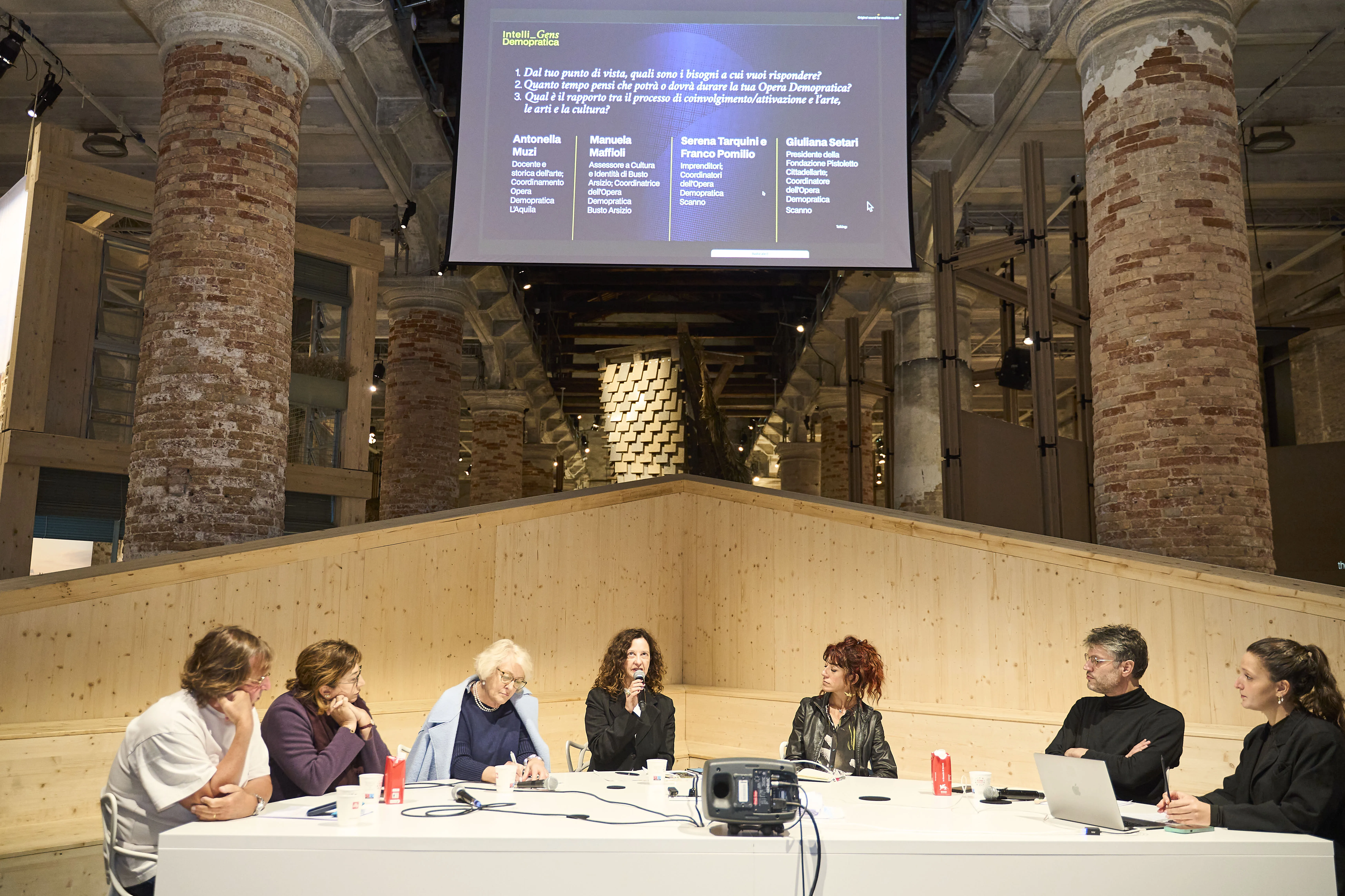 Alla domanda sulla durata delle opere, le risposte hanno tracciato una visione comune: la demopraxia non ha un tempo definito, ma si sviluppa come un processo continuo. Franco Pomilio ha dato la sua chiave di lettura: “Non possiamo fissare una scadenza. Il nostro compito è mettere in rete le energie del territorio, creare coordinamento e connessioni. È così che si costruisce una progettualità duratura”. Per Muzi, invece, la memoria delle azioni passate è parte integrante di questa continuità. Ha ricordato la performance del 2014, quando gli aquilani realizzarono un Terzo Paradiso con secchi da cantiere e acqua colorata: “Un gesto semplice ma potente, una rinascita simbolica. Ancora oggi, durante le visite guidate, il Terzo Paradiso di Pistoletto è sempre citato. È entrato nel racconto collettivo della città”. L’ultima domanda – sul rapporto tra partecipazione e arti – ha aperto una riflessione condivisa sulla forza trasformativa della bellezza. “L’arte ha la capacità di accedere alla mente e al cuore dell’individuo – ha affermato Setari –. È una forma di conoscenza e di responsabilità”. Pomilio ha ampliato il discorso: “L’arte è anticipatrice delle esigenze sociali, ma non è l’unico strumento. Bisogna mettere insieme le arti, anche la demopraxia stessa è un’arte civile. Un’opera, per me, deve produrre altre opere”. Per Maffioli, il legame tra cultura e cittadinanza è la chiave di un nuovo modello urbano: “Stiamo ripensando i luoghi culturali come spazi di partecipazione. La cultura non è un lusso, ma un bene comune che genera consapevolezza”. La sessione si è conclusa con un filo rosso condiviso: la demopraxia come infrastruttura di bellezza, partecipazione e responsabilità.