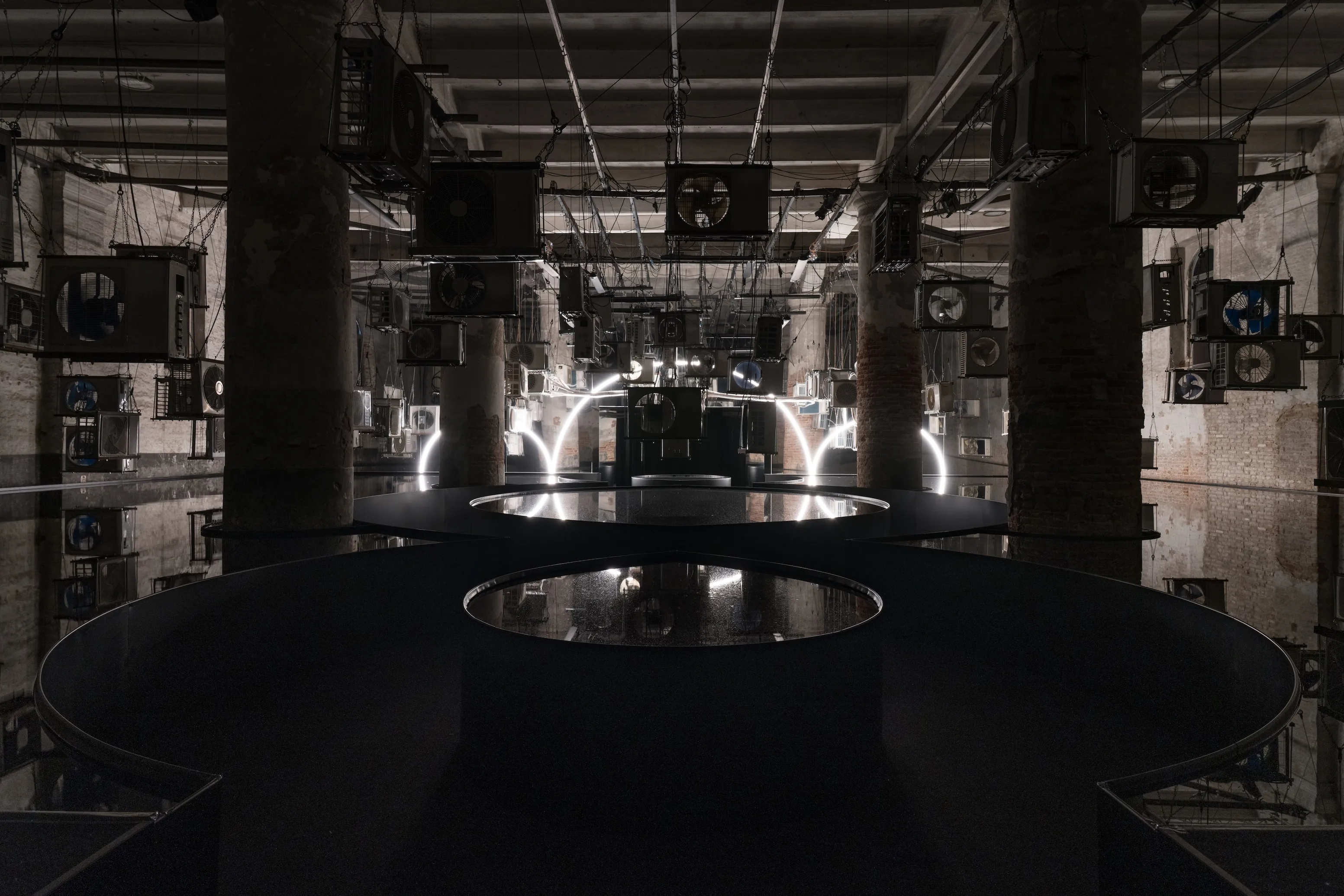 Cittadellarte ha inaugurato la Biennale Architettura 2025 con The Third Paradise Perspective, installazione collocata nella prima sala delle Corderie dell’Arsenale: luogo delle intenzioni, delle dichiarazioni, dei manifesti. Il pubblico è accolto in un ambiente immersivo e visionario: una sala allagata in cui l’acqua raggiunge i 70 cm, proiezione del livello marino previsto a Venezia nel 2100 secondo gli studi scientifici presentati in mostra. Attraverso questo scenario quasi distopico si estende un passaggio calpestabile a forma di Terzo Paradiso, simbolo creato da Michelangelo Pistoletto nel 2003 e divenuto, per questa Biennale, soglia fisica e concettuale. Infatti, il percorso luminoso dell’opera introduce il visitatore al cuore della mostra, proponendo un nuovo equilibrio tra natura e artificio.