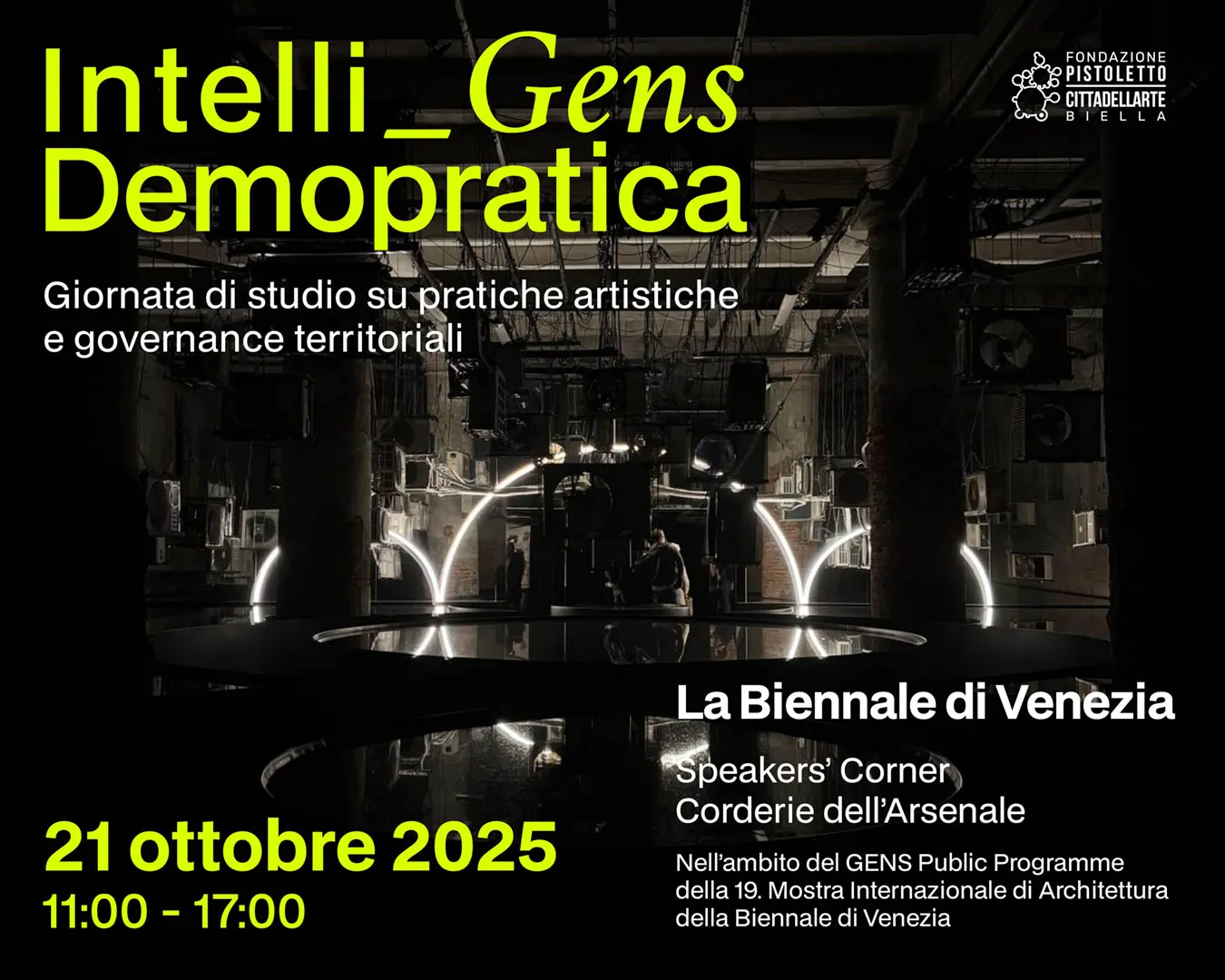 Proprio sulla scia e sulle orme della Demopraxia, martedì prossimo prenderà forma un incontro proposto da Cittadellarte: Intelli_Gens Demopratica, in programma il 21 ottobre 2025 dalle 11:00 alle 17:00 nello Speakers’ Corner delle Corderie dell’Arsenale. L'appuntamento, proposto nell’ambito del GENS Public Programme della Biennale, sarà una giornata di confronto dedicata all’intelligenza collettiva, alla responsabilità condivisa e alle nuove architetture civiche per la trasformazione sociale e territoriale. A partire dalla visione del Terzo Paradiso e dalla pratica concreta della Demopraxia, il programma prevede tavole rotonde e momenti di dialogo con studiosi, amministratori, artisti e operatori culturali attivi in diversi contesti internazionali. L'iniziativa si pone dunque come occasione per scoprire le Opere Demopratiche – cantieri di innovazione civica che generano impatto nei territori – e per riflettere insieme sulle sfide e le prospettive dell’azione pubblica condivisa.