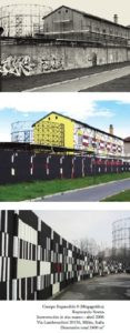 RS: Campo expandido nace a raíz de la observación, en la ciudad de Milán, Italia, y en particular ligado a un barrio que se llama Bovisa, un lugar ex industrial cuyo desarrollo ha sido fuertemente influenciado por el ferrocarril que lo atraviesa. Fue precisamente en 2006 que se me presentó la oportunidad de realizar un proyecto en un determinado espacio degradado. Una compañía de nombre EuroMilano me ofreció un espacio, lugar que visité y a raíz del cual hicimos un estudio de los requerimientos mínimos para poder rehabilitarlo y conformar un espacio donde se reestructurara ese contexto urbano, teniendo en cuenta no solo a su historia, sino los códigos gráficos y estéticos que se utilizaban en la época. Existían rastros en los muros de distintos mobiliarios de lo que fue ese lugar.