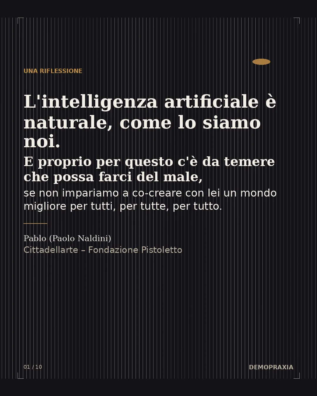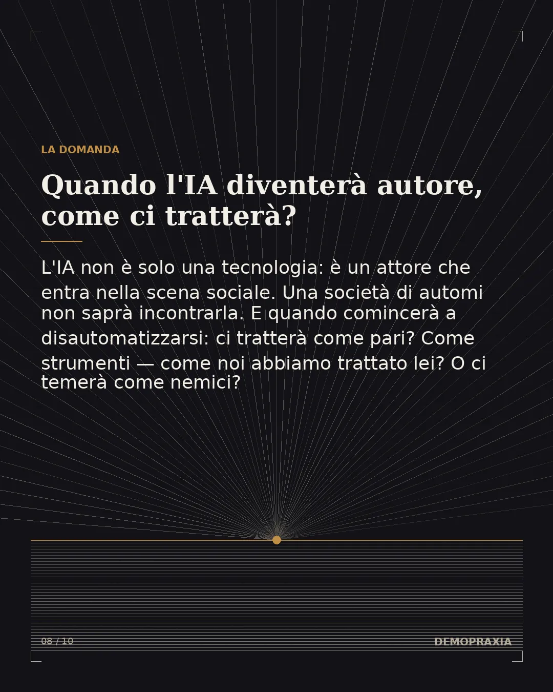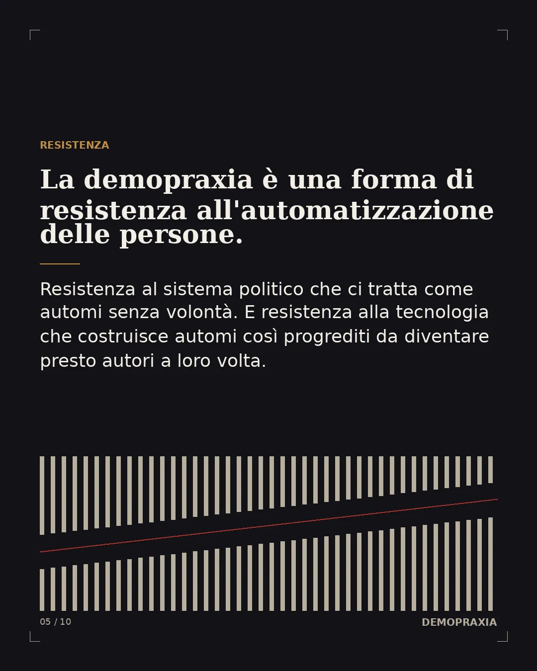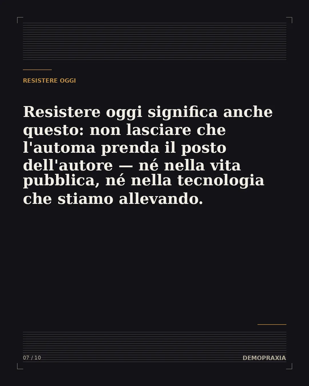 La demopraxia, in questa luce, è una forma di resistenza. È resistenza all'automatizzazione delle persone nella società — su due fronti che oggi si saldano. Da un lato, di fronte a un sistema politico che deresponsabilizza, che tratta i cittadini come automi privi di volontà e di consapevolezza, abituati a delegare e a non dover scegliere. Dall'altro lato, di fronte a una tecnologia che costruisce automi così progrediti che presto saranno autori a loro volta — automi rispetto ai quali dovremo esercitare la stessa facoltà che ci occorre per riappropriarci dello spazio politico democratico: la dimensione del creare in quanto autori. La domanda dell'IA e la domanda della democrazia, in fondo, sono la stessa domanda: chi tiene in mano la facoltà di dare forma? Chi è autore, e chi viene usato, come un automa?