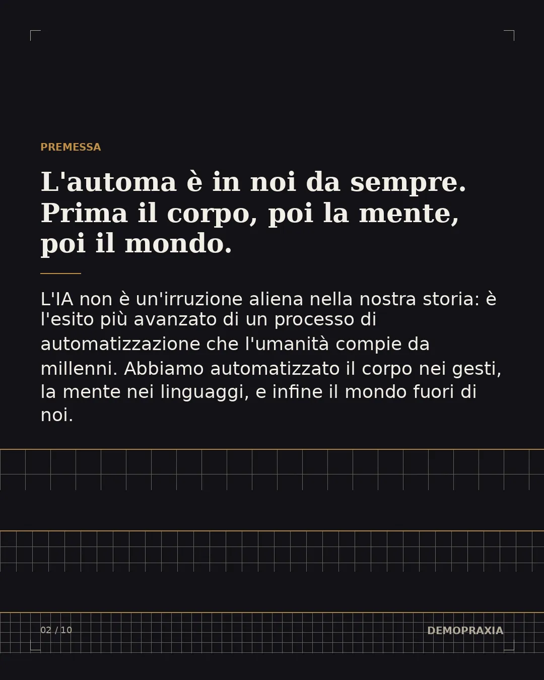 L'intelligenza artificiale non è un'irruzione aliena nel corso della nostra storia: è l'esito più avanzato di un lungo processo di automatizzazione che l'umanità ha compiuto nei millenni. Prima abbiamo automatizzato il nostro corpo, affidando ai gesti ripetuti, alle abitudini, ai riflessi, una parte sempre più ampia del nostro agire. Poi abbiamo automatizzato la nostra mente, costruendo linguaggi, codici, procedure, abitudini di pensiero che funzionano da soli, senza che dobbiamo ogni volta ripensarli. Solo in un secondo momento abbiamo imparato ad automatizzare ciò che sta fuori di noi: gli oggetti, le macchine, gli strumenti. L'IA, in questa prospettiva, non è una rottura ma un'evoluzione lineare: è l'automatizzazione che la natura ha già incarnato in noi, ora estesa ed esternalizzata nel mondo che abbiamo costruito.