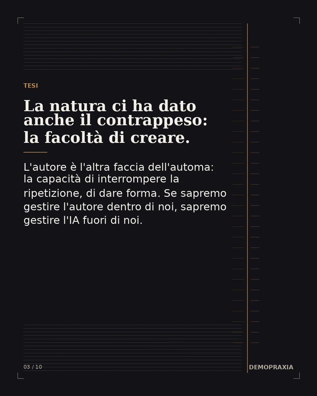 Ma se la natura ci ha consegnato l'automa, ci ha anche consegnato il suo contrappeso. Abbiamo incorporata in noi la facoltà con cui bilanciare l'eccesso di automatizzazione: è la facoltà del creare. È ciò che fa di noi non soltanto automi, ma autori. L'autore è l'altra faccia, indispensabile, dell'automa: la capacità di interrompere la ripetizione, di introdurre il nuovo, di scegliere e dare forma. Coltivare creazione è dunque l'antidoto all'automa — non per sopprimerlo, perché senza automatismi non potremmo vivere, ma per impedire che ci governi.