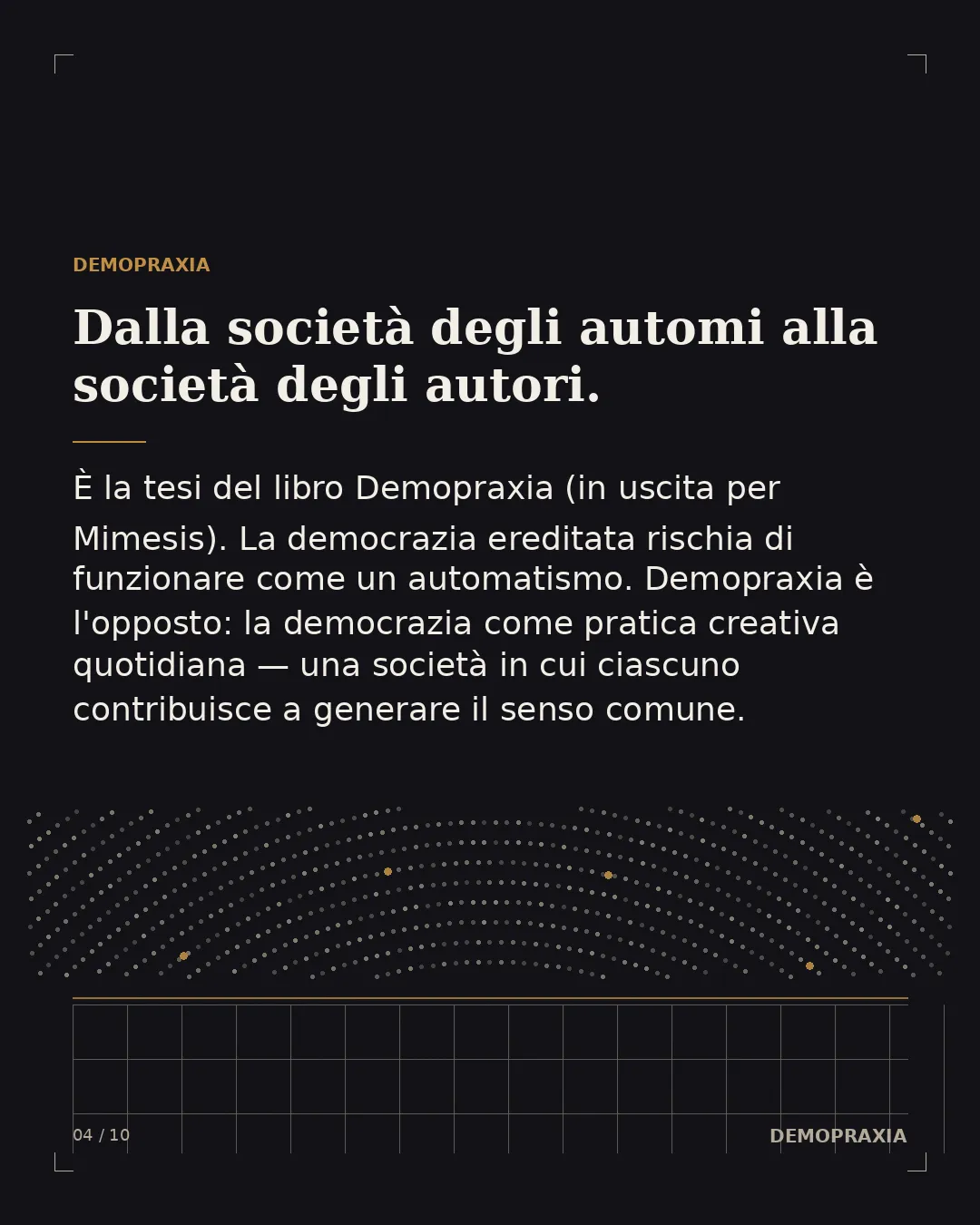 Questo passaggio — dall'automa all'autore — non riguarda soltanto la nostra costituzione individuale. È, prima di tutto, una questione collettiva, politica, civile. È la tesi che ho cercato di articolare in Demopraxia. Dalla società degli automi alla società degli autori (testo in uscita nei prossimi mesi per Mimesis): la democrazia, così come l'abbiamo ereditata, rischia di funzionare come un automatismo. Si vota, si delega, si ripete il rito a scadenze regolari, e nel frattempo le decisioni vengono prese altrove, da meccanismi economici, mediatici, tecnologici che girano per conto loro. In questa configurazione, il cittadino è ridotto a automa: esegue una procedura prevista, e in cambio gli viene restituita l'illusione di aver partecipato. Demopraxia significa l'esatto contrario: non la democrazia come forma data, ma la democrazia come pratica creativa, come esercizio quotidiano della facoltà di autore. Una società degli autori è una società in cui ciascuno contribuisce a generare il senso comune, invece di limitarsi a confermarlo.