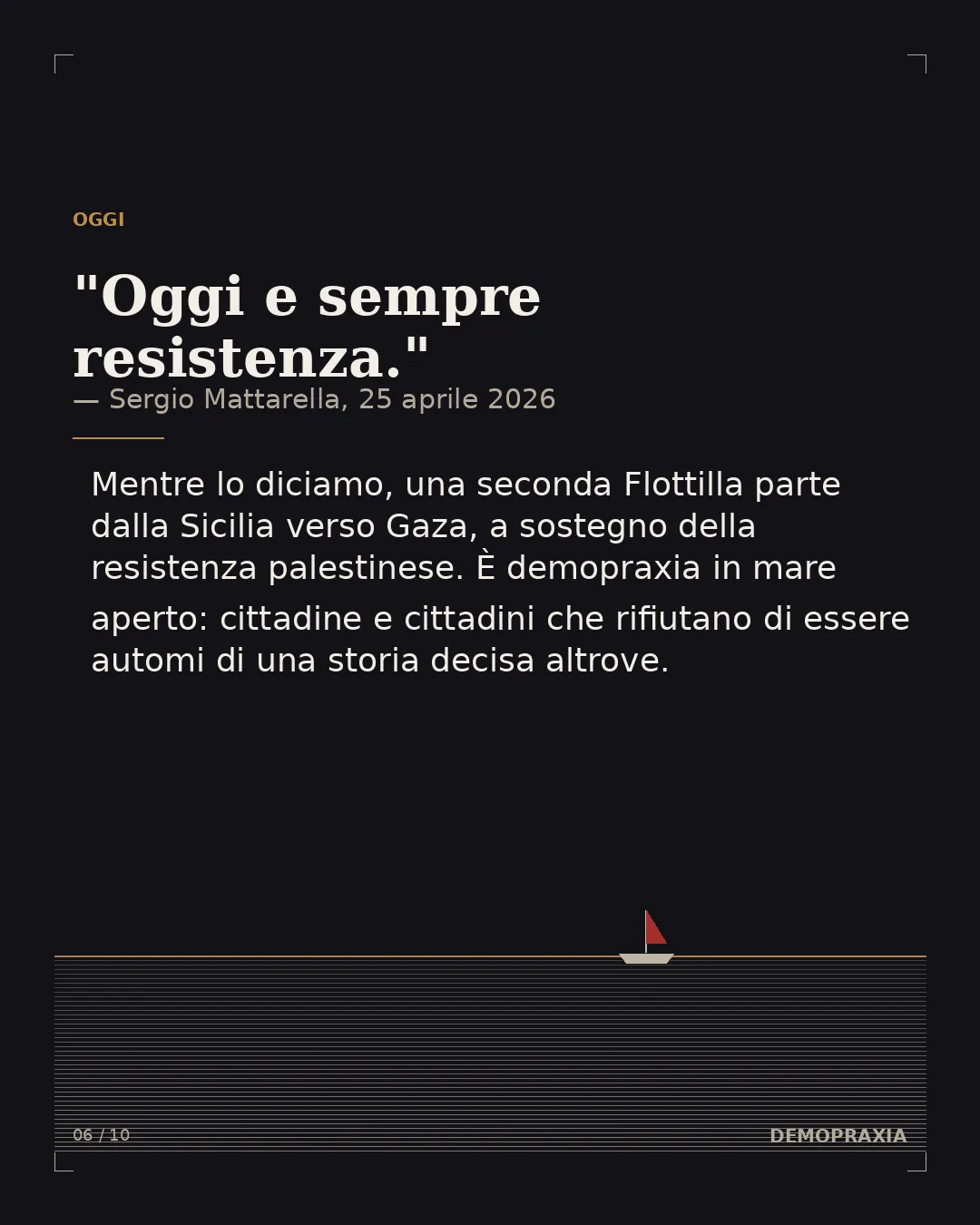 E mentre lo diciamo, una seconda Flottilla parte dalla Sicilia verso Gaza. Salpa per sostenere la resistenza del popolo palestinese, per aprire un corridoio umanitario, per opporre un atto di volontà alla rassegnazione organizzata davanti a un genocidio in corso. È resistenza nel senso più diretto del termine: cittadine e cittadini che rifiutano di essere automi di una storia decisa altrove, e che riprendono in mano la facoltà di dare forma a ciò che accade. È demopraxia in mare aperto.