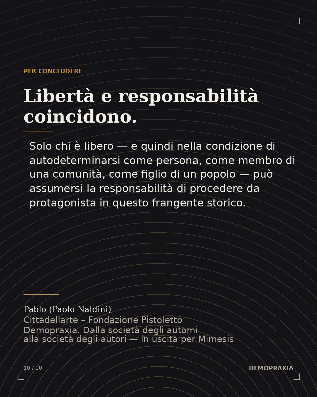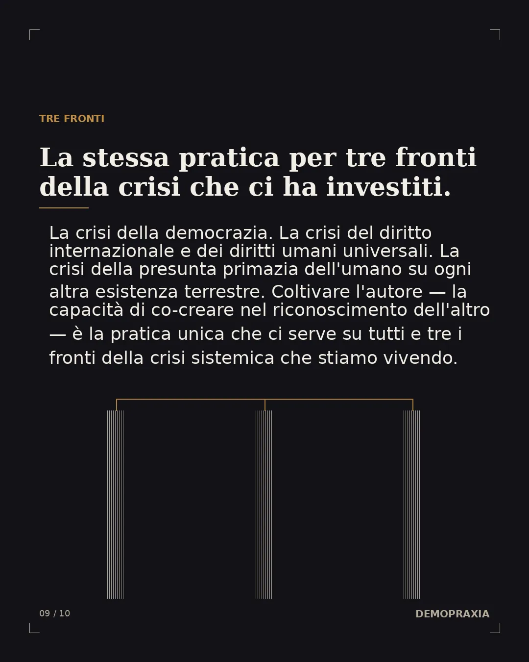 Può sembrare strano che la stessa pratica — coltivare l'autore, e la capacità di co-creare insieme agli altri sulla base del riconoscimento del pieno diritto di ognuno a esistere e autodeterminarsi — sia ciò di cui abbiamo bisogno per affrontare tre fronti diversi della crisi sistemica che ci ha investiti: la crisi della democrazia, la crisi del diritto internazionale e dei diritti umani universali, e la crisi della presunta primazia dell'umano su ogni altra esistenza terrestre. Eppure è così. Forse la formula per racchiudere questi tre fronti in un unico sguardo è la comprensione della piena coincidenza di libertà e responsabilità. Solo chi è libero — e quindi nella condizione di autodeterminarsi come persona, come membro di una comunità, come figlio di un popolo — può assumersi la responsabilità di procedere da protagonista in questo frangente storico.