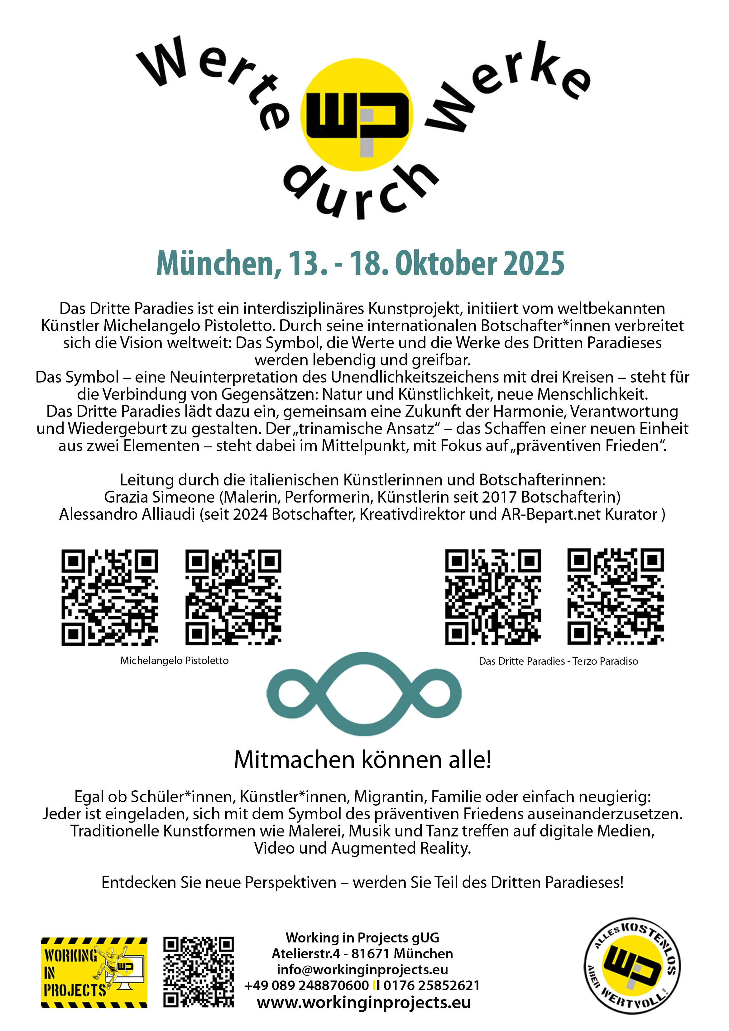 “La forza di questo progetto sta nella collaborazione: scuole, migranti, artisti, associazioni, tutti uniti dallo stesso desiderio di costruire legami di pace attraverso il linguaggio universale dell’arte”, afferma Grazia Simeone. “Per me è una gioia vedere come l’idea del Terzo Paradiso possa germogliare anche a Monaco, coinvolgendo generazioni e culture diverse in un’unica visione condivisa di rinascita”.