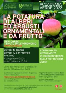 Il 27 gennaio si terrà il primo dei tre incontri dedicati alla potatura curati dall'agronomo Enrico Regis. L'appuntamento, organizzato dall'associazione Let Eat Bi e proposto nell'ambito del programma dell'Accademia Verde 2022, si terrà interamente su Zoom. La scadenza delle iscrizioni è fissata al 24 gennaio: ecco come partecipare.